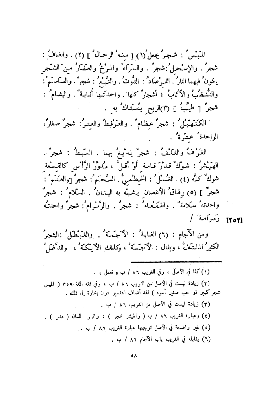 الغرف والغلف: شجر يدبغ بهما. السبط شجر الهيشر: شوك قدر قامة أو أقل، مدور الرأس كالقمعة شوك كله. الغسل: الخطمي. السحم: شجر [والعنم: شجر] رقاق الأغصان يشبه به البنان. السلام: شجر واحدته سلامة. والقفعاء: شجر. الرمرام: شجر واحدته رمرامة.