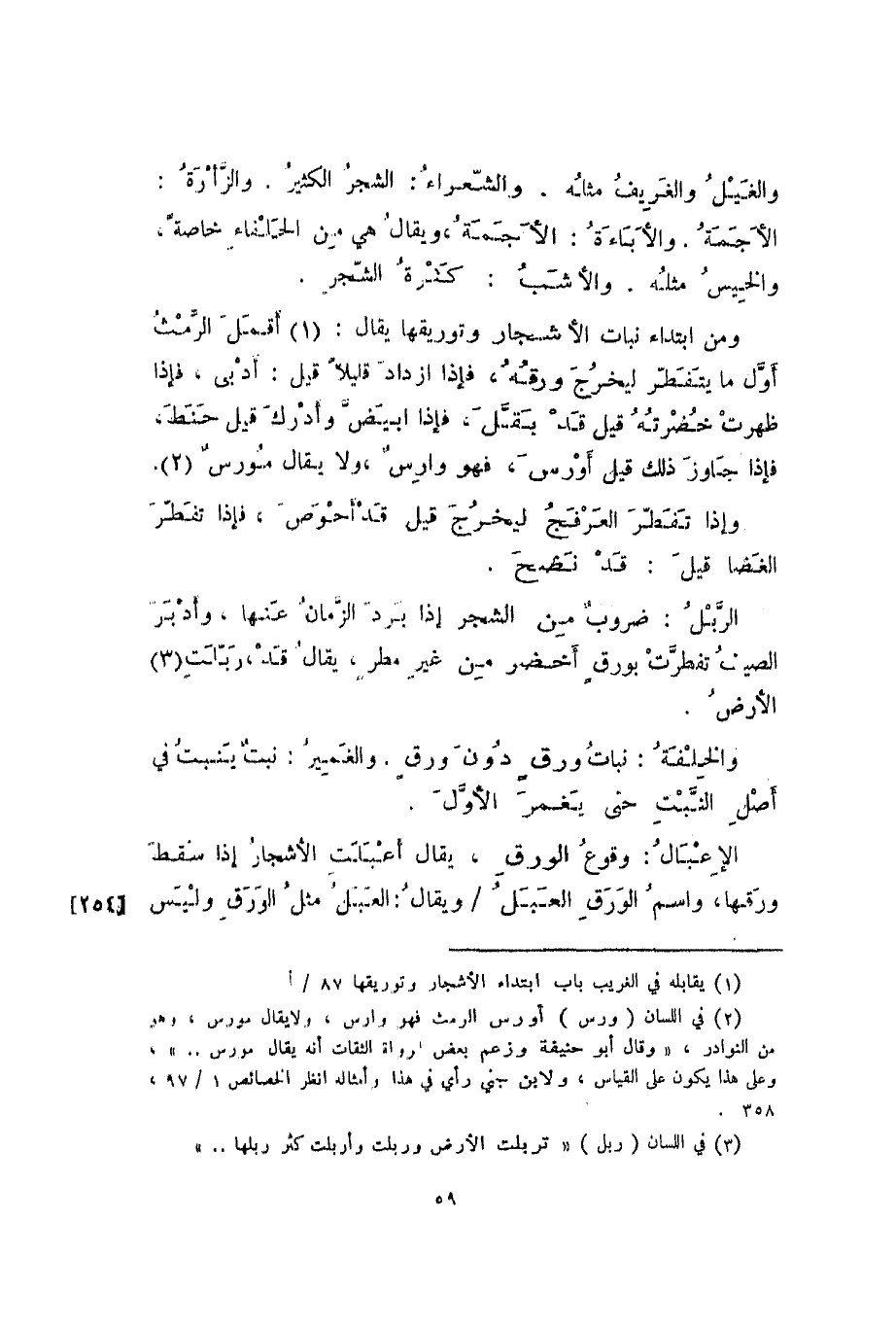 ومن ابتداء نبات الأشجار وتوريقها يقال: أقمل الرمث أول ما يتفطر ليخرج ورقه، فإذا ازداد قليلاً قيل: أدبى، فإذا ظهرت خضرته قيل قد بقل، فإذا ابيض وأدرك قيل حنط، فإذا جاوز ذلك قيل أورس، فهوا وارس، ولا يقال مورس.