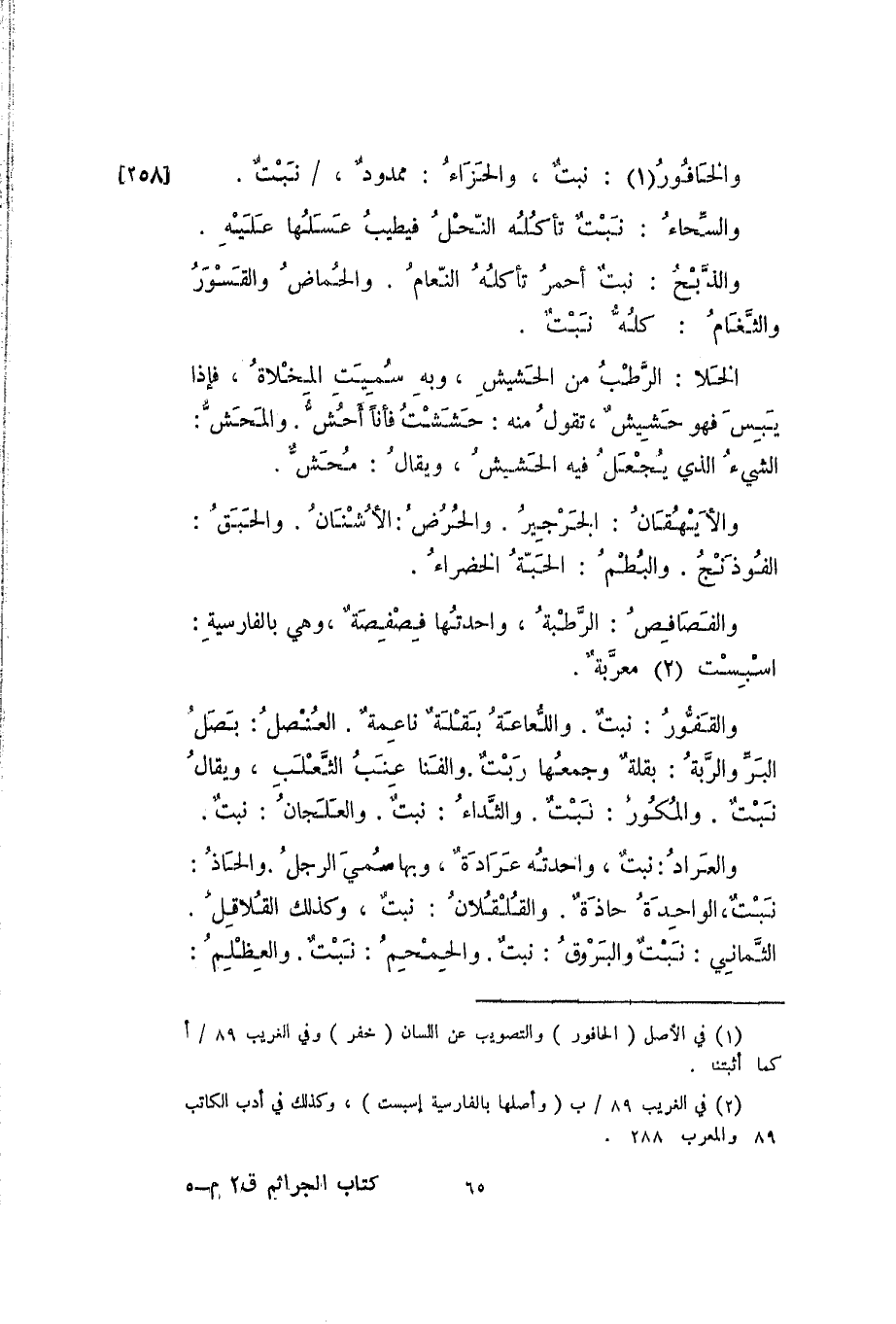 والقفور: نبت. واللعاعة بقلة ناعمة. العنصل: بصل البر والربة: بقلة وجمعها ربت. والفنا عنب الثغلب، ويقال نبت. والمكور: نبت. والثداء: نبت. والعلجان: نبت.