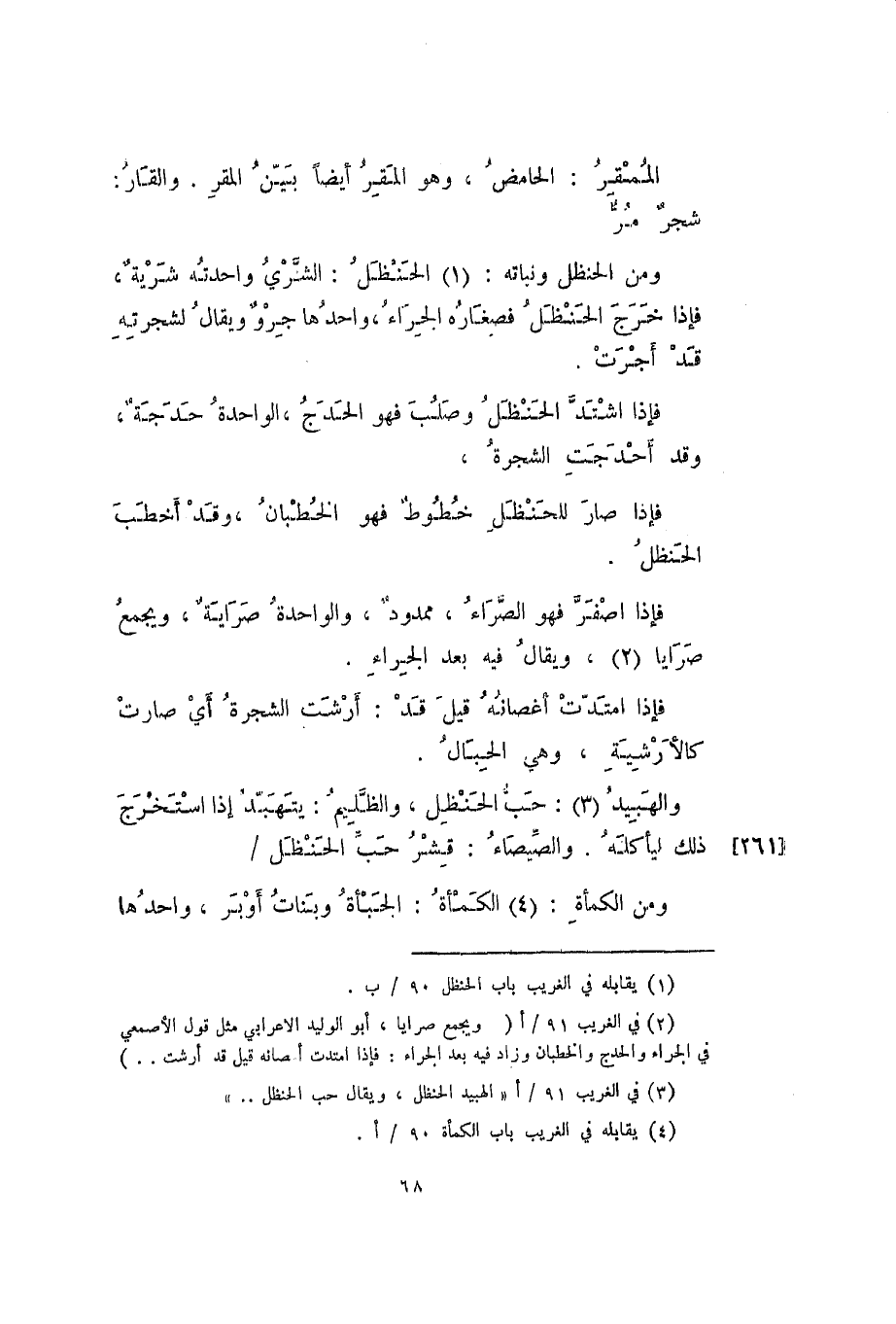 ومن الحنظل ونباته: الحنظل: الشري واحدته شرية، فإذا خرج الحنظل فصغاره الجراء، واحدها جرو ويقال لشجرته قد أجرت.
