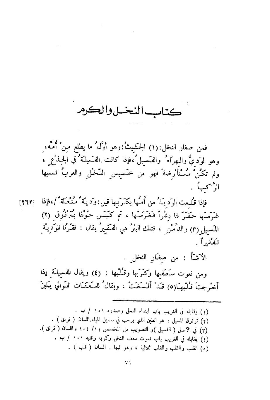 فمن صغار النخل: الجثيث: وهو أول ما يطلع من أمه، وهو الودي والهراء والفسيل، فإذا كانت الفسيلة في الجذع ولم تكن مستأرضة فهو من خسيس النخل والعرب تسميها الراكب.