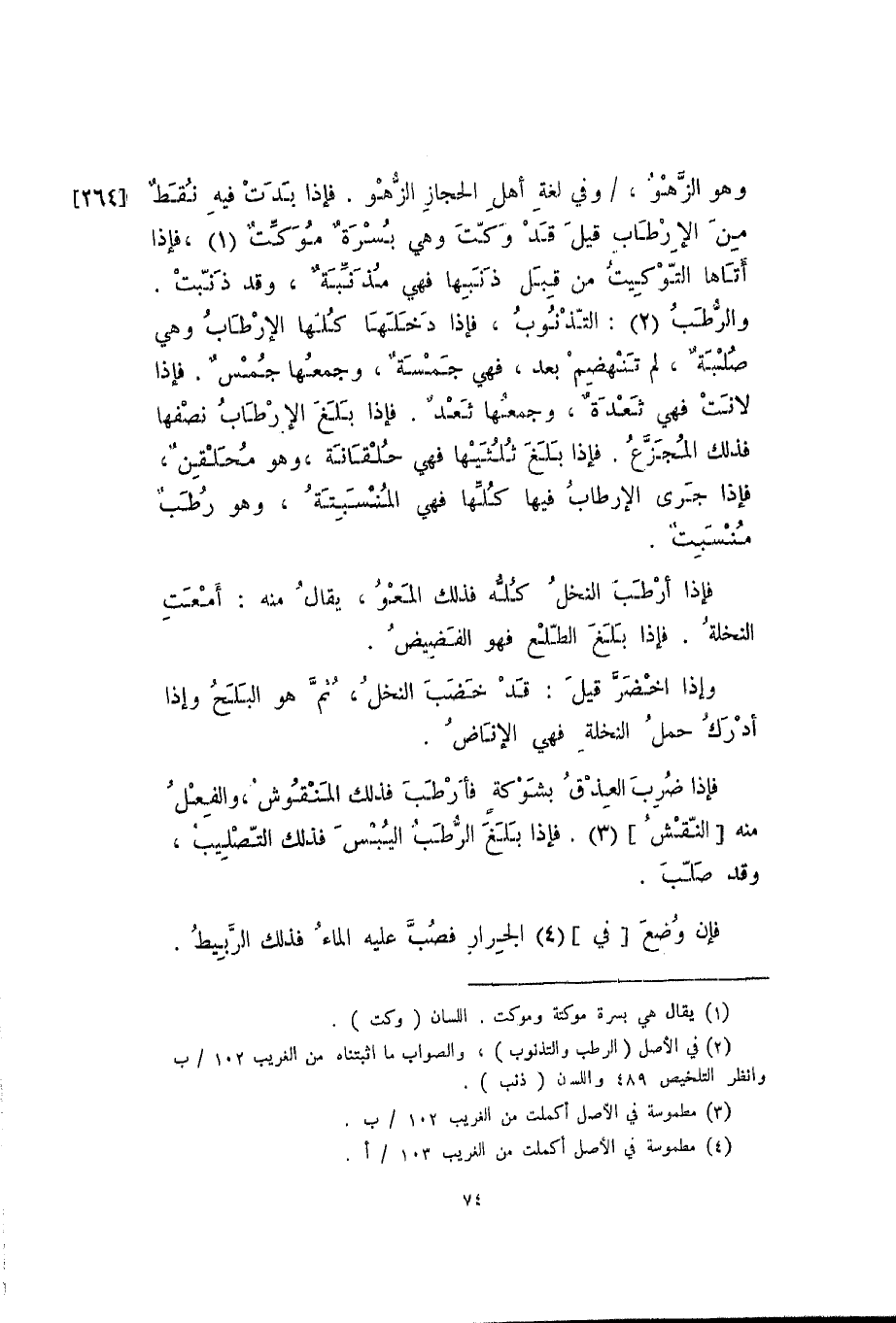 والرطب التذنوب، فإذا دخلها كلها الإرطاب وهي صلبة، لم تنهضم بعد، فهي جمسة، وجمعها جمس. فإذا لانت فهي ثعدة، وجمعها ثعد. فإذا بلغ الإرطاب نصفها فذلك المجزع. فإذا بلغ ثلثيها فهي حلقانة، وهو محلقن، فإذا جرى الإرطاب فيها كلها فهي المنسبتة، وهو رطب منسبت.