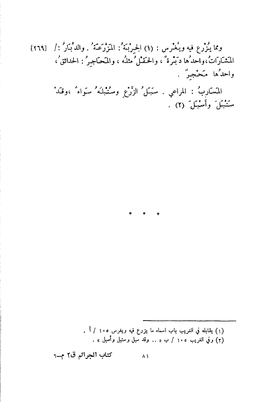 ومما يزرع فيه ويغرس: الجربة: المزرعة. والدبار: المشارات، واحدها دبرة، والحقل مثله، ووالمحاجر: الحدائق، واحدها محجر.