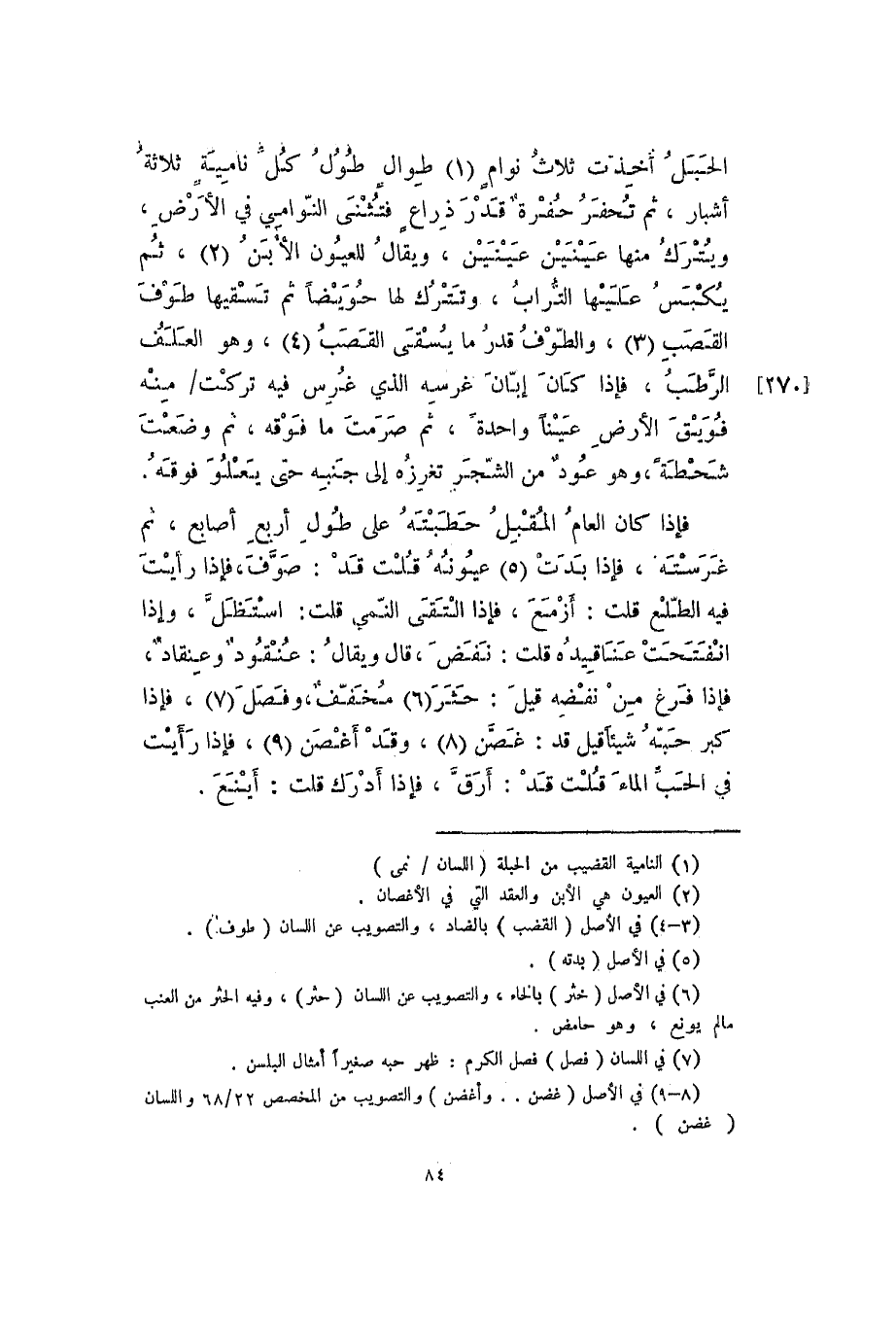 فإذا كان العام المقبل حطبته على طول أربع أصابع، ثم غرسته، فإذا بدت عيونه قلت قد: صوف، فإذا رأيت فيه الطلع: قلت أزمع، فإذا التقى النمي قلت: استظل، وإذا انفتحت عناقيده قلت: نفض، قال ويقال: عنقود وعنقاد، فإذا فرغ من نفضه قيل: حثر مخفف مفصل، فإذا كبر حبه شيئاً قيل قد: غصن، وقد أغصن، فإذا رأيت في الحب الماء قلت قد: أرق، فإذا أدرك قلت: أينع.