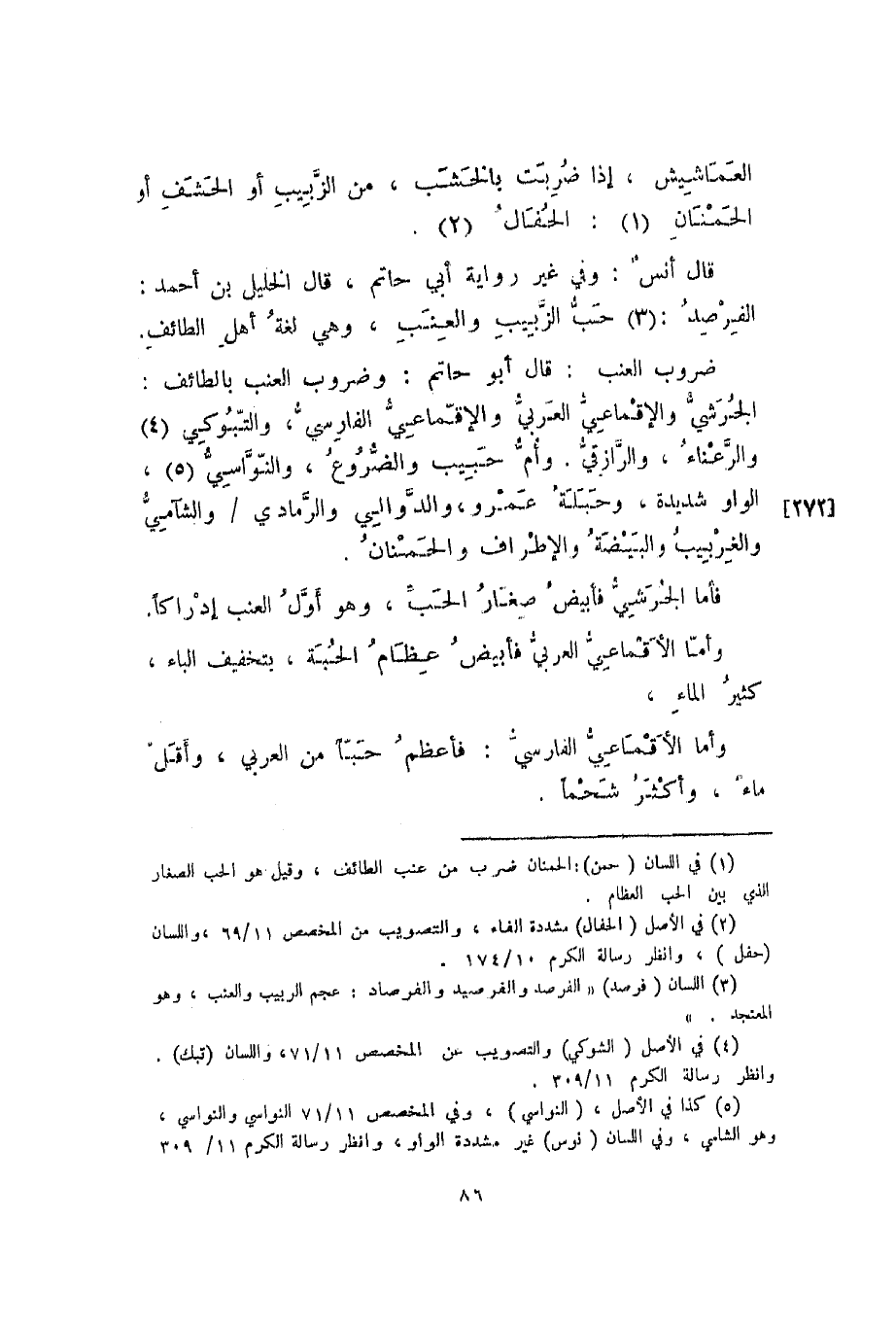 قال أنس: وفي غير رواية أبي حاتم، قال الخليل بن أحمد: الفرصد: حب الزبيب والعنب، وهي لغة أهل الطائف.