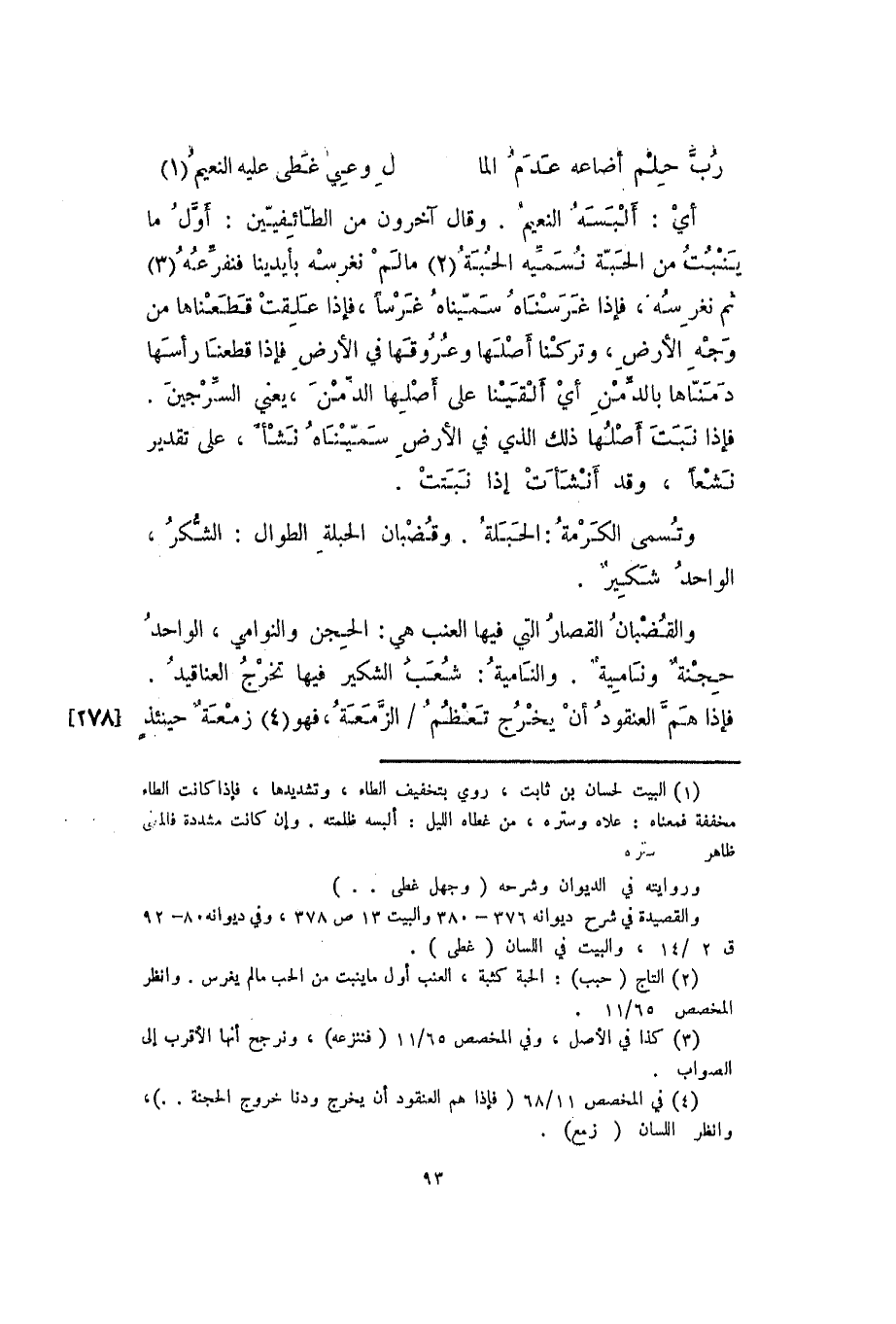 أي: ألبسه النعيم. وقال آخرون من الطائفيين: أول ما ينبت من الحبة نسميه الحبة ما لم نغرسه بأيدينا فنفرعه ثم نغرسه، فإذا غرسناه سميناه غرساً، فإذا علقت قطعناها من وجه الأرض، وتركنا أصلها وعروقها في الأرض فإذا قطعنا رأسها دمناها بالدمن أي ألقينا على أصلها الدمن، يعني السرجين.
