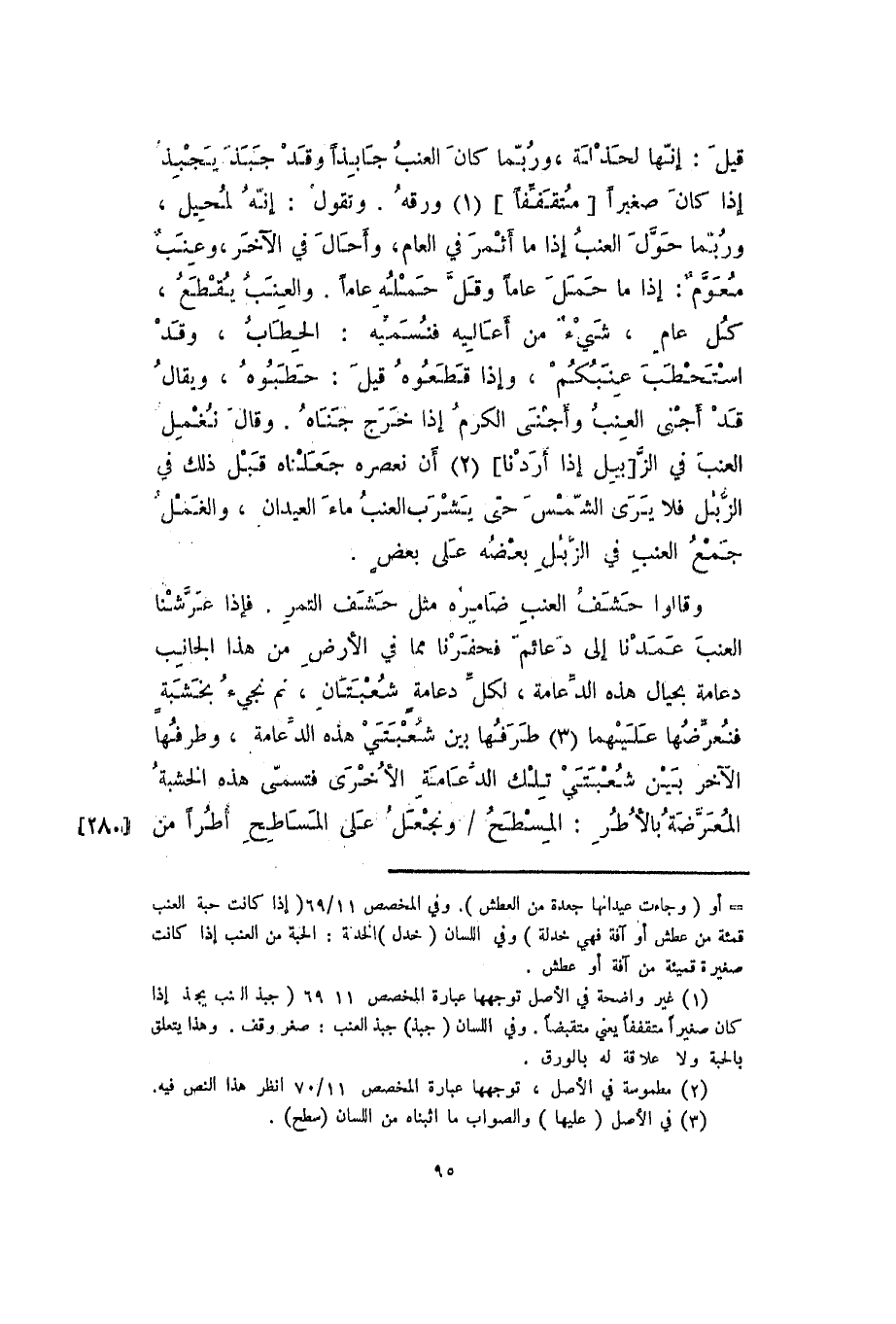 وقالوا حشف العنب ضامرة مثل حشف التمر. فإذا عرشنا العنب عمدنا إلى دعائم فحفرنا مما في الأرض من هذا الجانب دعامة بحيال هذه الدعامة، لكل دعامة شعبتان، ثم نجيء بخشبة فنعرضها عليهما طرفها بين شعبتي هذه الدعامة، وطرفها الآخر بين شعبتي تلك الدعامة الأخرى فتسمى هذه الخشبة المعرضة بالأطر: المسطح ونجعل على المساطح أطراً من