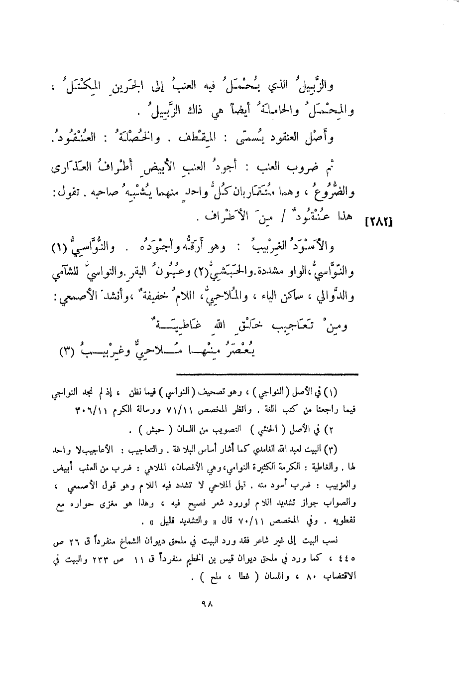 والأسود الغربيب: وهو أرقه وأجوده. والنواسي والنواسي، الواو مشددة. والحبشي وعيون البقر. والنواسي للشآمي والدواللي، ساكن الياء، والملاحي، اللام خفيفة، وأنشد الأصمعي: