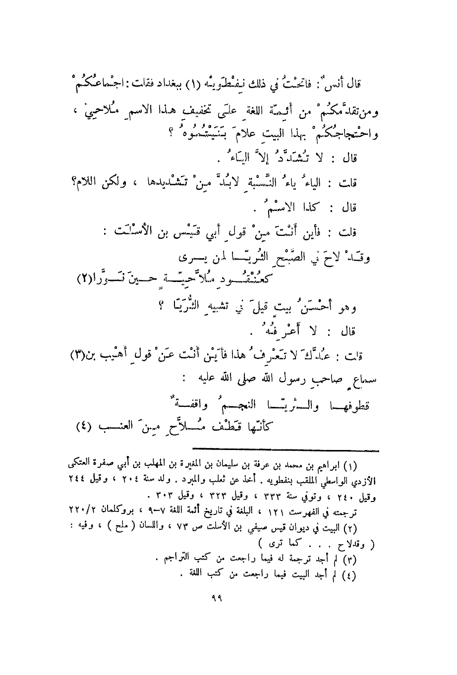 قال أنس: فاتحت في ذلك نفطويه ببغداد فقلت: إجماعكم ومن تقدمكم من أئمة اللغة على تخفيف هذا الاسم ملاحي، واحتجاجكم بهذا البيت علام بنيتموه؟ قال: لا تشدد إلا الياء.