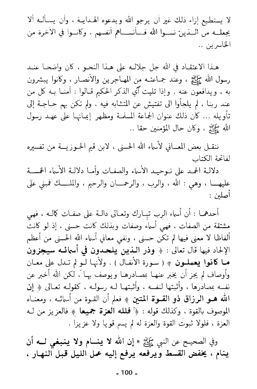 ننقل بعض المعاني لأسماء الله الحسنى، لابن قيم الجوزية من تفسيره لفاتحة الكتاب دلالة الحمد على توحيد الأسماء والصفات وأما دلالة الأسماء الخمسة عليها، وهي: الله، والرب، والرحمان والرحيم، والملك فمبني على أصلين: