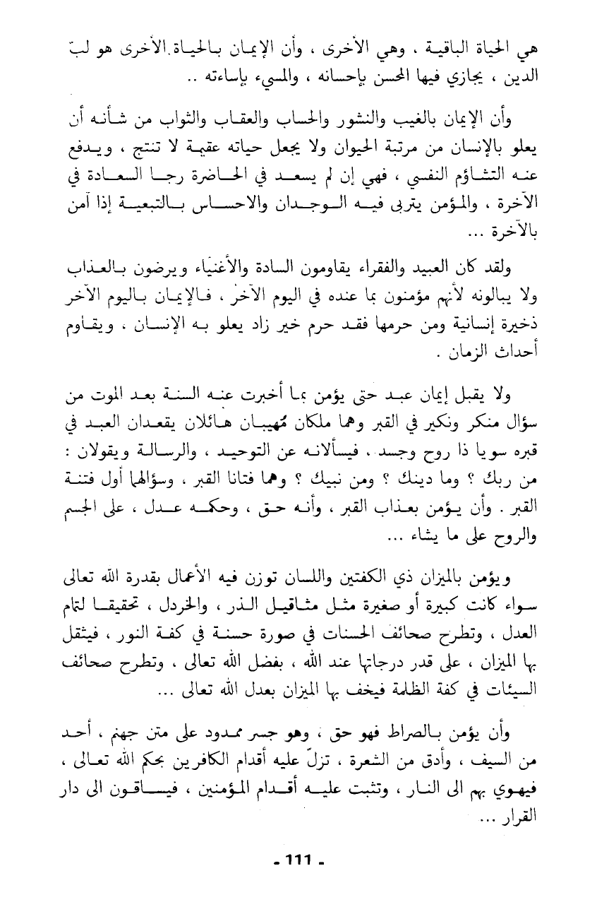 ولا يقبل إيمان عبد حتى يؤمن بما أخبرت عنه السنة بعد الموت من سؤال منكر ونكير في القبر وهما ملكان مهيبان هائلان يقعدان العبد في قبره سويا ذا روح وجسد، فيسألانه عن التوحيد، والرسالة ويقولان: من ربك؟ وما دينك؟ ومن نبيك؟ وهما فتانا القبر، وسؤالهما أول فتنة القبر. وأن يؤمن بعذاب القبر، وأنه حق، وحكمه عدل، على الجسم والروح على ما يشاء ...