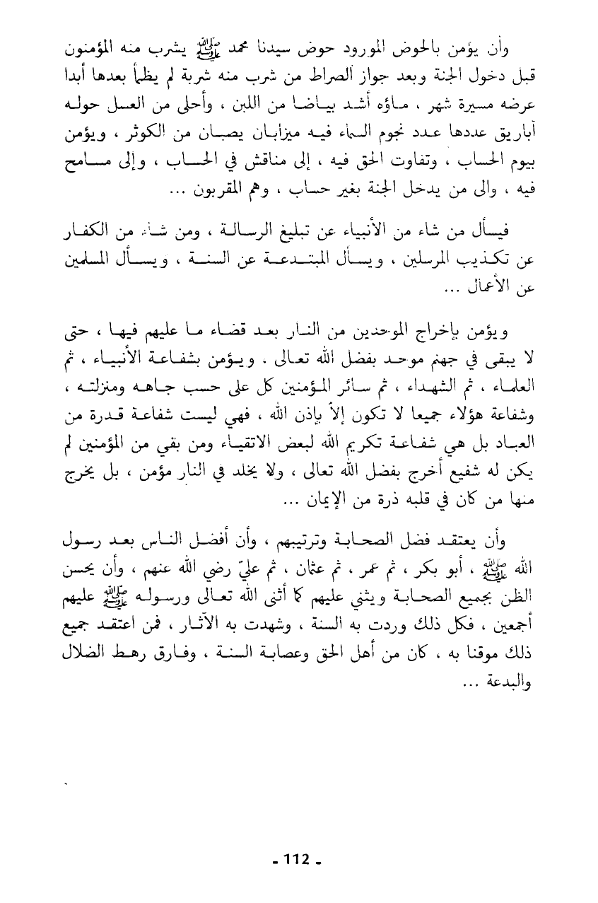 وأن يؤمن بالحوض المورود حوض سيدنا محمد - صلى الله عليه وسلم - يشرب منه المؤمنون قبل دخول الجنة وبعد جواز الصراط من شرب منه شربة لم يظمأ بعدها أبدا عرضه مسيرة شهر، ماؤه أشد بياضا من اللبن، وأحلى من العسل حوله أباريق عددها عدد نجوم السماء فيه ميزابان يصبان من الكوثر، ويؤمن بيوم الحساب، وتفاوت الحق فيه، إلى مناقش في الحساب، وإلى مسامح فيه، وإلى من يدخل الجنة بغير حساب، وهم المقربون ...