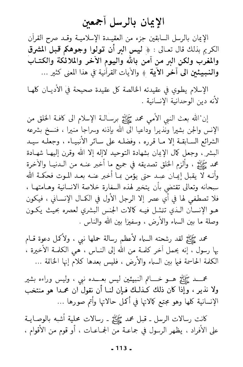 إن الله بعث النبي الأمي محمد - صلى الله عليه وسلم - برسالة الإسلام إلى كافة الخلق من الإنس والجن بشيرا ونذيرا وداعيا إلى الله بإذنه وسراجا منيرا، فنسخ بشرعه الشرائع السابقة إلا ما قرره، وفضله على سائر الأنبياء، وجعله سيد البشر، وجعل كمال الإيمان بشهادة التوحيد لا إله إلا الله وقرن إليها شهادة محمد - صلى الله عليه وسلم -، وألزم الخلق تصديقه في جميع ما أخبر عنه من الدنيا والآخرة وأنه لا يقبل إيمان عبد حتى يؤمن بما أخبر عنه بعد الموت فحكمة الله سبحانه وتعالى تقتضي بأن يتخير لهذه السفارة خلاصة الإنسانية وهامتها، فلا تصطفي لها في أي عصر إلا الرجل الأول في الكمال الإنساني، فيكون هو الإنسان الذي تتمثل فيه كمالات الجنس البشري لعصره بحيث يكون وصلة ما بين السماء والأرض، وسفيرا بين الله والناس.