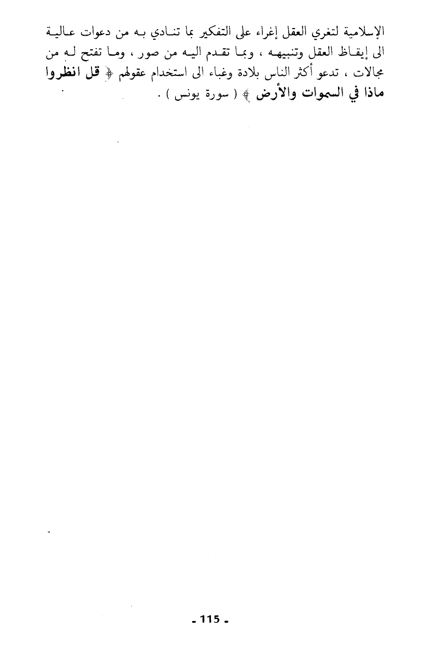 الإسلامية لتغري العقل إغراء على التفكير بما تنادي به من دعوات عالية إلى إيقاظ العقل وتنبيهه، وبما تقدم إليه من صور، وما تفتح له من مجالات، تدعو أكثر الناس بلادة وغباء إلى استخدام عقولهم {قُلِ انْظُرُوا مَاذَا فِي السَّمَاوَاتِ وَالْأَرْضِ} (سورة يونس).