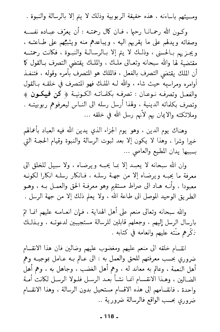 وكون الله رحمانا رحيما، فإن كمال رحمته: أن يعرف عباده نفسه وصفاته ويدلهم على ما يقربهم إليه، ويباعدهم منه ويثبتهم على طاعته، ويجزيهم بالحسنى، وذلك لا يتم إلا بالرسالة والنبوة، فكانت رحمته مقتضية لها ولله سبحانه وتعالى ملك، والملك يقتضي التصرف بالقول كما أن الملك يقتضي التصرف بالفعل، فالملك هو المتصرف بأمره وقوله، فتنفذ أوامره ومراسيمه حيث شاء، والله له الملك فهو المتصرف في خلقه بالقول والفعل وتصرفه نوعان: تصرفه بكلماته الكونية {كُنْ فَيَكُونُ} وتصرف بكلماته الدينية، ولهذا أرسل رسله إلى الناس ليعرفوهم ربوبيته وملائكته والايمان بهم لأنهم رسل الله في خلقه ...