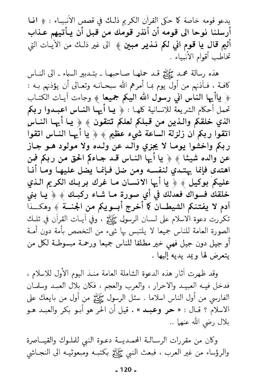 هذه رسالة محمد - صلى الله عليه وسلم - قد حملها صاحبها- بتدبير السماء- إلى الناس كافة، فآذنهم من أول يوم بما أمرهم الله سبحانه وتعالى أن يؤذنهم به: {يَا أَيُّهَا النَّاسُ إِنِّي رَسُولُ اللَّهِ إِلَيْكُمْ جَمِيعًا} وجاءت آيات الكتاب تحمل أحكام الشريعة للإنسانية كلها: {يَا أَيُّهَا النَّاسُ اعْبُدُوا رَبَّكُمُ الَّذِي خَلَقَكُمْ وَالَّذِينَ مِنْ قَبْلِكُمْ لَعَلَّكُمْ تَتَّقُونَ} {يَا أَيُّهَا النَّاسُ اتَّقُوا رَبَّكُمْ إِنَّ زَلْزَلَةَ السَّاعَةِ شَيْءٌ عَظِيمٌ} {يَا أَيُّهَا النَّاسُ اتَّقُوا رَبَّكُمْ وَاخْشَوْا يَوْمًا لَا يَجْزِي وَالِدٌ عَنْ وَلَدِهِ وَلَا مَوْلُودٌ هُوَ جَازٍ عَنْ وَالِدِهِ شَيْئًا} {يَا أَيُّهَا النَّاسُ قَدْ جَاءَكُمُ الْحَقُّ مِنْ رَبِّكُمْ فَمَنِ اهْتَدَى فَإِنَّمَا يَهْتَدِي لِنَفْسِهِ وَمَنْ ضَلَّ فَإِنَّمَا يَضِلُّ عَلَيْهَا وَمَا أَنَا عَلَيْكُمْ بِوَكِيلٍ} {يَا أَيُّهَا الْإِنْسَانُ مَا غَرَّكَ بِرَبِّكَ الْكَرِيمِ * الَّذِي خَلَقَكَ فَسَوَّاكَ فَعَدَلَكَ * فِي أَيِّ صُورَةٍ مَا شَاءَ رَكَّبَكَ} {يَا بَنِي آدَمَ لَا يَفْتِنَنَّكُمُ الشَّيْطَانُ كَمَا أَخْرَجَ أَبَوَيْكُمْ مِنَ الْجَنَّةِ} وهكذا تكررت دعوة الإسلام على لسان الرسول - صلى الله عليه وسلم -، وفي آيات القرآن في تلك الصورة العامة للناس جميعا لا يلتبس بها شيء من التخصص بأمة دون أمة أو جيل دون جيل فهي خير مطلقا للناس جميعا ورحمة مبسوطة لكل من يتعرض لها ويمد يديه إليها.