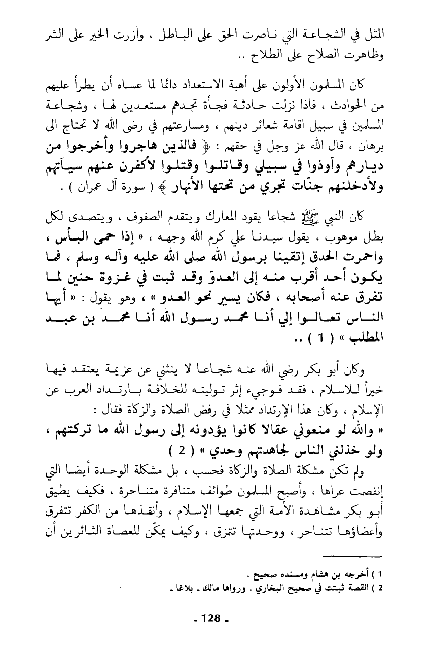 كان المسلمون الأولون على أهبة الاستعداد دائما لما عساه أن يطرأ عليهم من الحوادث، فإذا نزلت حادثة فجأة تجدهم مستعدين لها، وشجاعة المسلمين في سبيل إقامة شعائر دينهم، ومسارعتهم في رضى الله لا تحتاج إلى برهان، قال الله عز وجل في حقهم: {فَالَّذِينَ هَاجَرُوا وَأُخْرِجُوا مِنْ دِيَارِهِمْ وَأُوذُوا فِي سَبِيلِي وَقَاتَلُوا وَقُتِلُوا لَأُكَفِّرَنَّ عَنْهُمْ سَيِّئَاتِهِمْ وَلَأُدْخِلَنَّهُمْ جَنَّاتٍ تَجْرِي مِنْ تَحْتِهَا الْأَنْهَارُ} (سورة آل عمران).