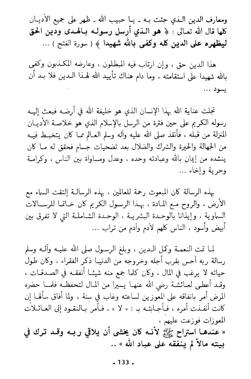 بهذه الرسالة كان المبعوث رحمة للعالين، بهذه الرسالة إلتقت السماء مع الأرض، والروح مع المادة، بهذا الرسول الكريم كان خاتما للرسالات السماوية، وإيذانا بالوحدة البشرية، الوحدة الشاملة التي لا تفرق بين أبيض وأسود، الناس كلهم لآدم وآدم من تراب ...