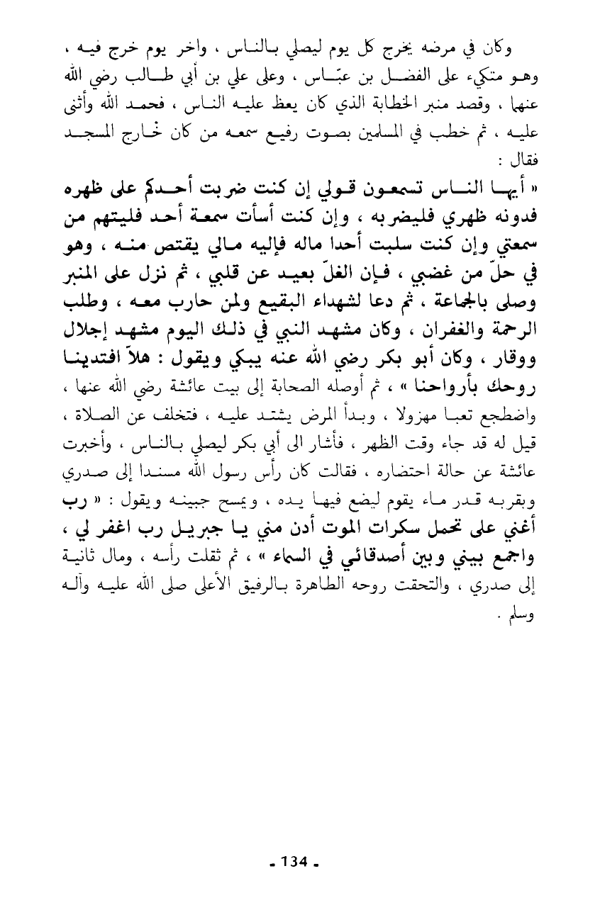 وكان في مرضه يخرج كل يوم ليصلي بالناس، وآخر يوم خرج فيه، وهو متكيء على الفضل بن عباس، وعلى علي بن أبي طالب رضي الله عنهما، وقصد منبر الخطابة الذي كان يعظ عليه الناس، فحمد الله وأثنى عليه، ثم خطب في المسلمين بصوت رفيع سمعه من كان خارج المسجد فقال: "أيها الناس تسمعون قولي إن كنت ضربت أحدكم على ظهره فدونه ظهري فليضربه، وإن كنت أسأت سمعة أحد فليتهم من سمعتي وإن كنت سلبت أحدا ماله فإليه مالي يقتص منه، وهو في حل من غضبي، فإن الغل بعيد عن قلبي، ثم نزل على المنبر وصلى بالجماعة، ثم دعا لشهداء البقيع ولمن حارب معه، وطلب الرحمة والغفران، وكان مشهد النبي في ذلك اليوم مشهد إجلال ووقار، وكان أبو بكر رضي الله عنه يبكي ويقول: هلا افيتدينا روحك بأرواحنا"، ثم أوصله الصحابة إلى بيت عائشة رضي الله عنها، واضطجع تعبا مهزولا، وبدأ المرض يشتد عليه، فتخلف عن الصلاة، قيل له قد جاء وقت الظهر، فأشار إلى أبي بكر ليصلي بالناس، وأخبرت عائشة عن حالة احتضاره، فقالت كان رأس رسول الله مسندا إلى صدري وبقربه قدر ماء يقوم ليضع فيها يده، ويمسح جبينه ويقول: "رب أغني على تحمل سكرات الموت أدن مني يا جبريل رب اغفر لي، واجمع بيني وبين أصدقائي في السماء"، ثم ثقلت رأسه، ومال ثانية إلى صدري، والتحقحت روحه الطاهرة بالرفيق الأعلى صلى الله عليه وآله وسلم.