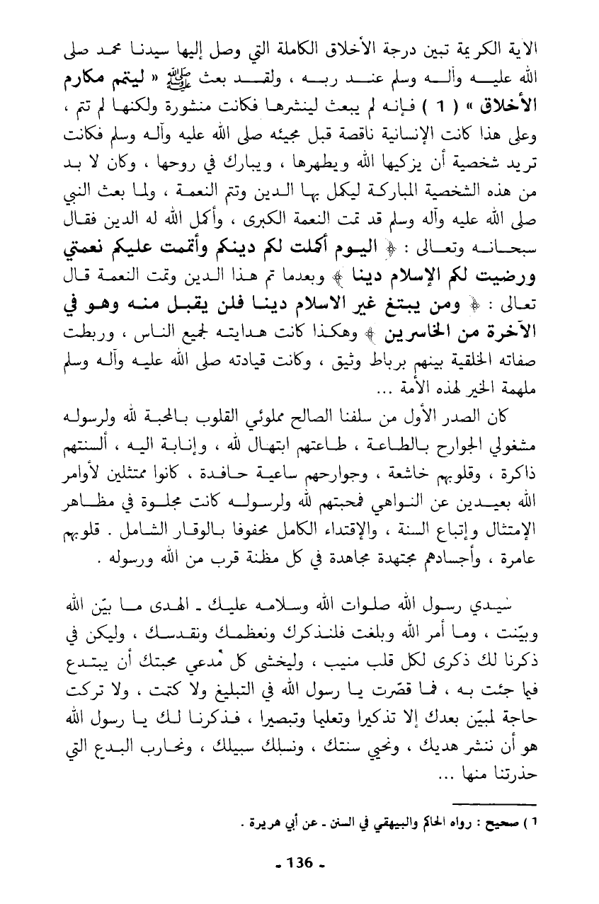 سيدي رسول الله صلوات الله وسلامه عليك- الهدى ما بين الله وبينت، وما أمر الله وبلغت فلنذكرك ونعظمك ونقدسك، وليكن في ذكرنا لك ذكرى لكل قلب منيب، وليخشى كل مدعي محبتك أن يبتدع فيما جئت به، فما قصرت يا رسول الله في التبليغ ولا كتمت، ولا تركت حاجة لمبين بعدك إلا تذكيرا وتعليما وتبصيرا، فذكرنا لك يا رسول الله هو أن ننشر هديك، ونحيي سنتك، ونسلك سبيلك، ونحارب البدع التي حذرتنا منها ...