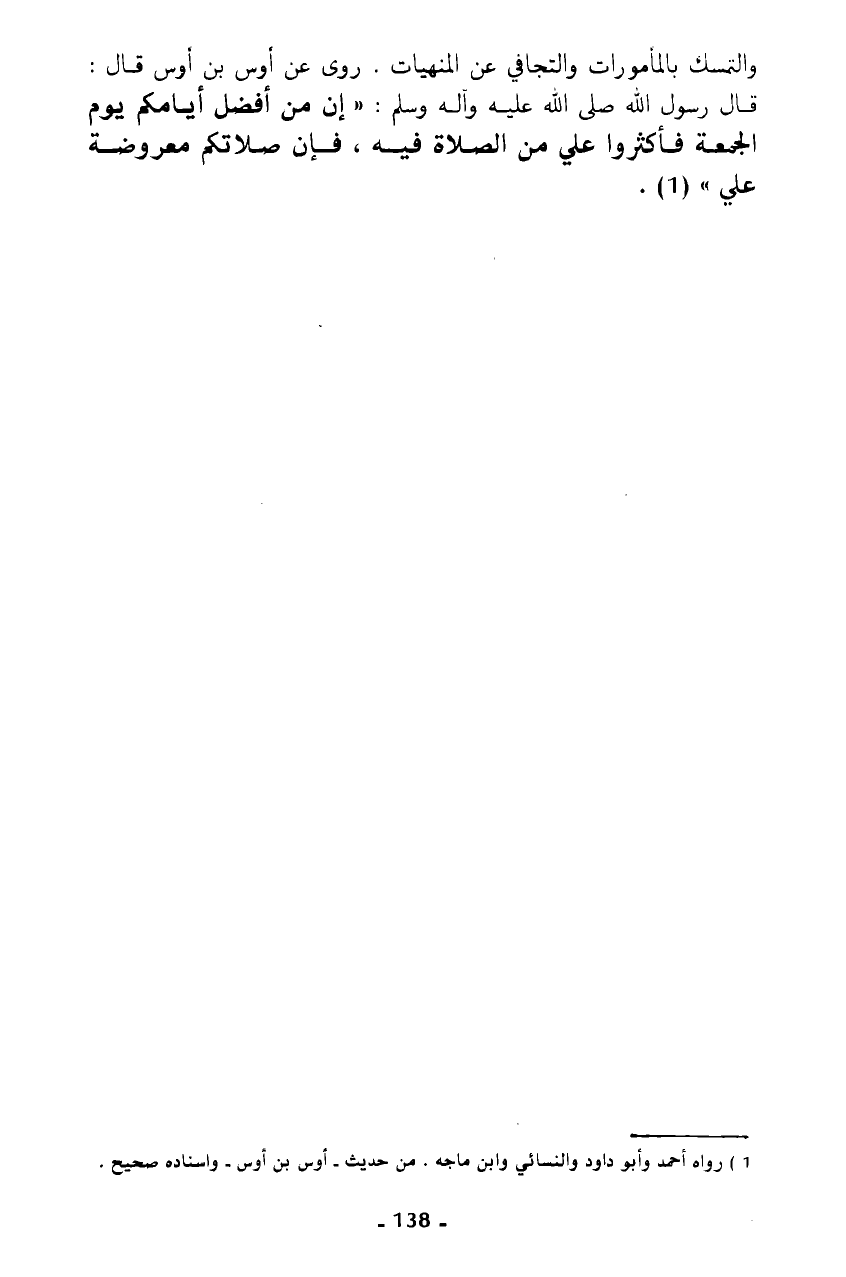 والتسمك بالمأمورات والتجافي عن المنهيات. روى عن أوس بن أوس قال: قال رسول الله صلى الله عليه وآله وسلم: "إن من أفضل أيامكم يوم الجمعة فأكثروا علي من الصلاة فيه، فإن صلاتكم معروضة علي" (¬1).