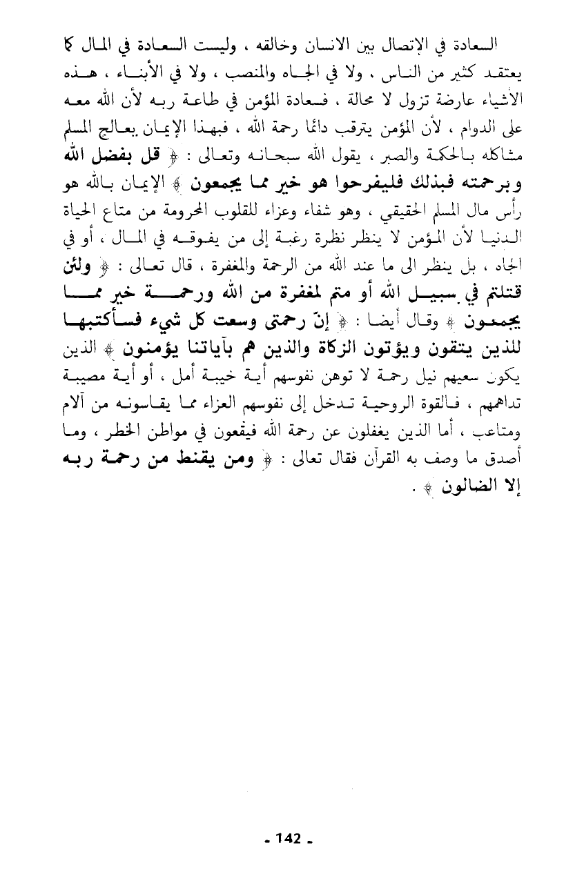 السعادة في الإتصال بين الإنسان وخالقه، وليست السعادة في المال كما يعتقد كثير من الناس، ولا في الجاه والمنصب، ولا في الأبناء، هذه الأشياء عارضة تزول لا محالة، فسعادة المؤمن في طاعة ربه لأن الله معه على الدوام، لأن المؤمن يترقب دائما رحمة الله، فبهذا الإيمان يعالج المسلم مشاكله بالحكمة والصبر، يقول الله سبحانه وتعالى: {قُلْ بِفَضْلِ اللَّهِ وَبِرَحْمَتِهِ فَبِذَلِكَ فَلْيَفْرَحُوا هُوَ خَيْرٌ مِمَّا يَجْمَعُونَ} الإيمان بالله هو رأس مال المسلم الحقيقي، وهو شفاء وعزاء للقلوب المحرومة من متاع الحياة الدنيا لأن المؤمن لا ينظر نظرة رغبة إلى من يفوقه في المال، أو في الجاه، بل ينظر إلى ما عند الله من الرحمة والمغفرة، قال تعالى: {وَلَئِنْ قُتِلْتُمْ فِي سَبِيلِ اللَّهِ أَوْ مُتُّمْ لَمَغْفِرَةٌ مِنَ اللَّهِ وَرَحْمَةٌ خَيْرٌ مِمَّا يَجْمَعُونَ} وقال أيضا: {وَرَحْمَتِي وَسِعَتْ كُلَّ شَيْءٍ فَسَأَكْتُبُهَا لِلَّذِينَ يَتَّقُونَ وَيُؤْتُونَ الزَّكَاةَ وَالَّذِينَ هُمْ بِآيَاتِنَا يُؤْمِنُونَ} الذين يكون سعيهم نيل رحمة لا توهن نفوسهم أية خيبة أمل، أو أية مصيبة تداهمهم، فالقوة الروحية تدخل إلى نفوسهم العزاء مما يقاسونه من آلام ومتاعب، أما الذين يغفلون عن رحمة الله فيقعون في مواطن الخطر، وما أصدق ما وصف به القرآن فقال تعالى: {وَمَنْ يَقْنَطُ مِنْ رَحْمَةِ رَبِّهِ إِلَّا الضَّالُّونَ}.