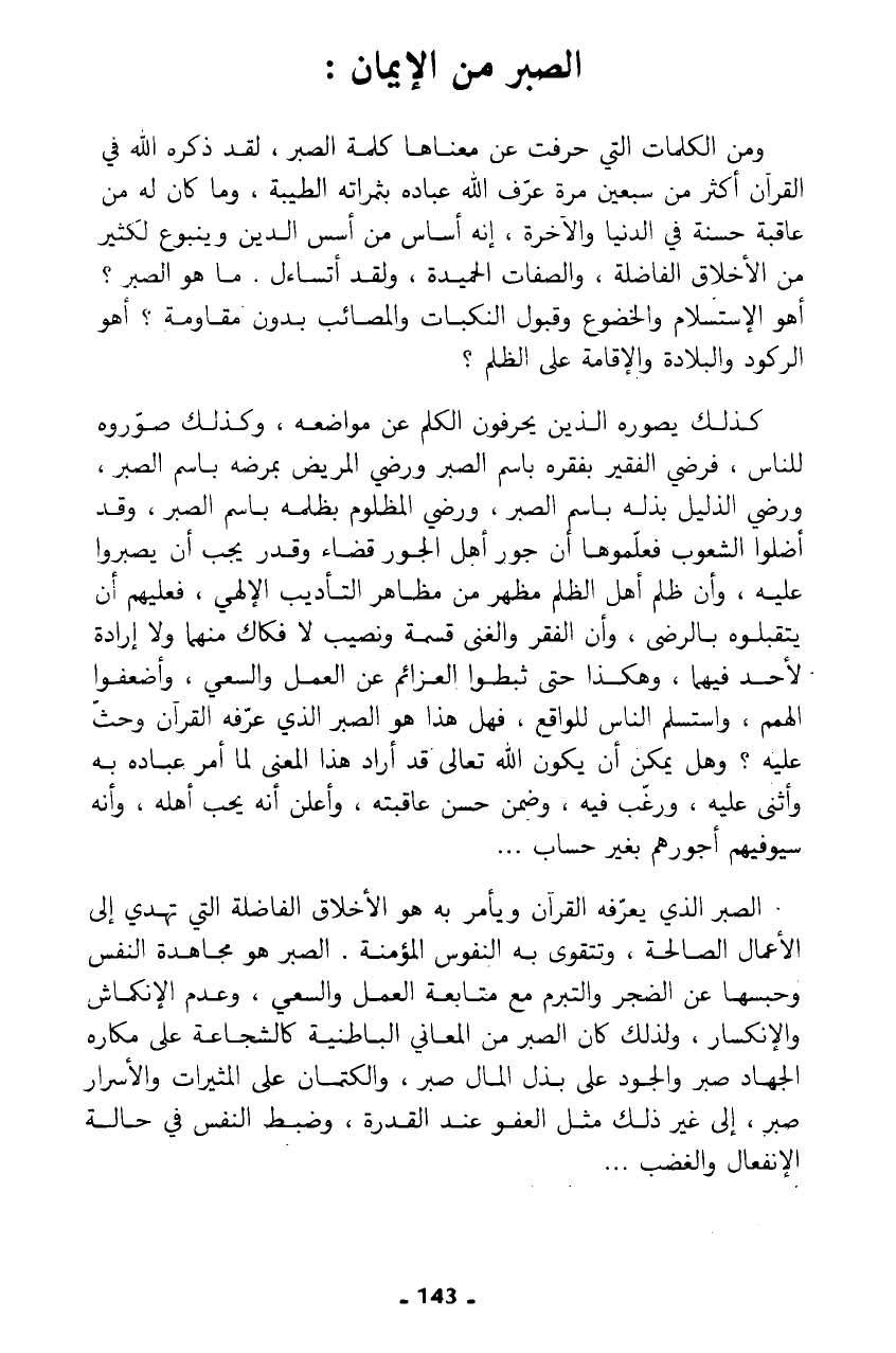 ومن الكلمات التي حرفت عن معناها كلمة الصبر، لقد ذكره الله في القرآن أكثر من سبعين مرة عرف الله عباده بثمراته الطيبة، وما كان له من عاقبة حسنة في الدنيا والآخرة، إنه أساس من أسس الدين وينبوع لكثير من الأخلاق الفاضلة، والصفات الحميدة، ولقد أتساءل. ما هو الصبر؟ أهو الإستسلام والخضوع وقبول النكبات والمصائب بدون مقاومة؟ أهو الركود والبلادة والإقامة على الظلم؟
