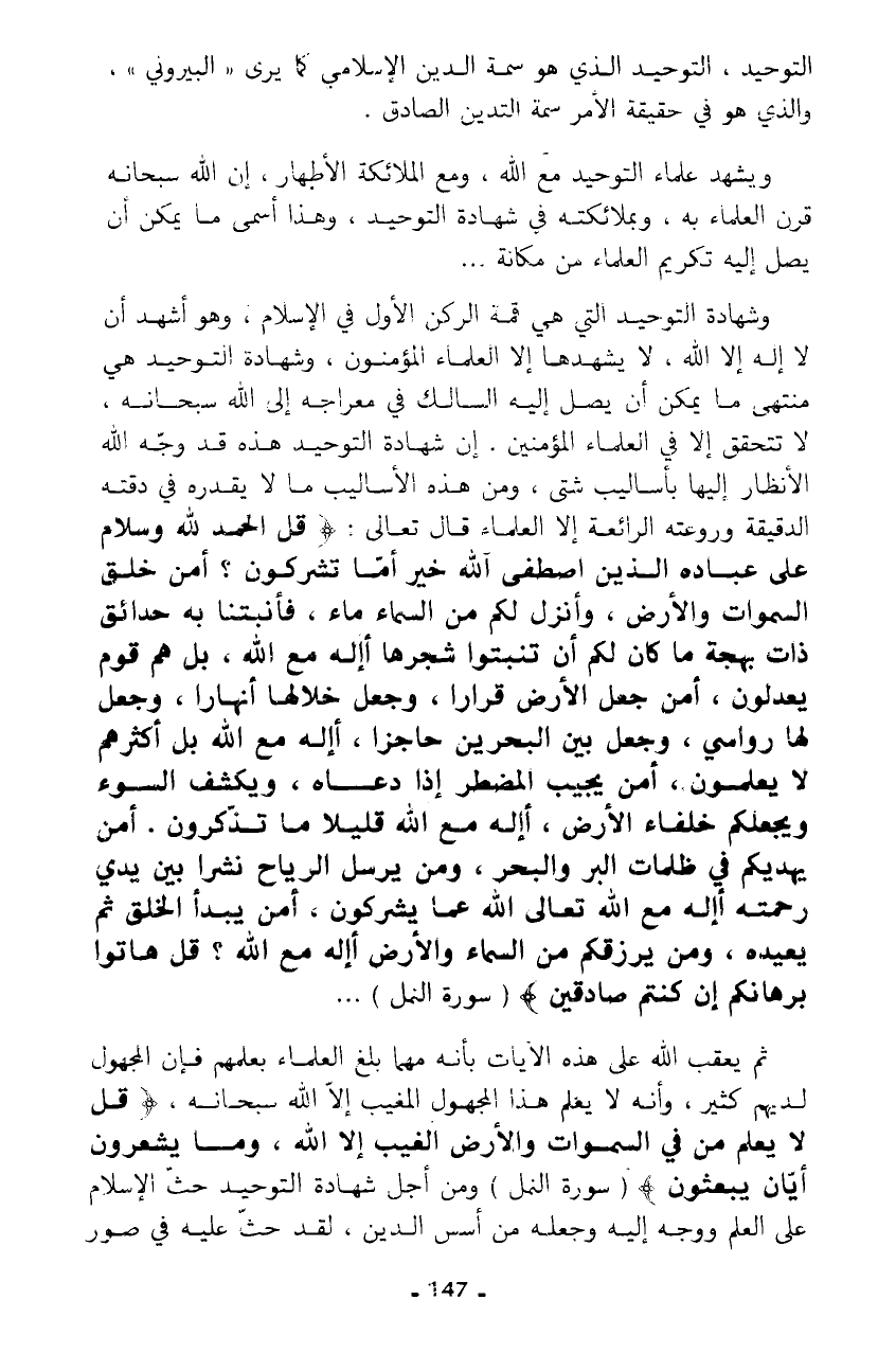 التوحيد، التوحيد الذي هو سمة الدين الإسلامي كما يرى "البيروني"، والذي هو في حقيقة الأمر سمة التدين الصادق.