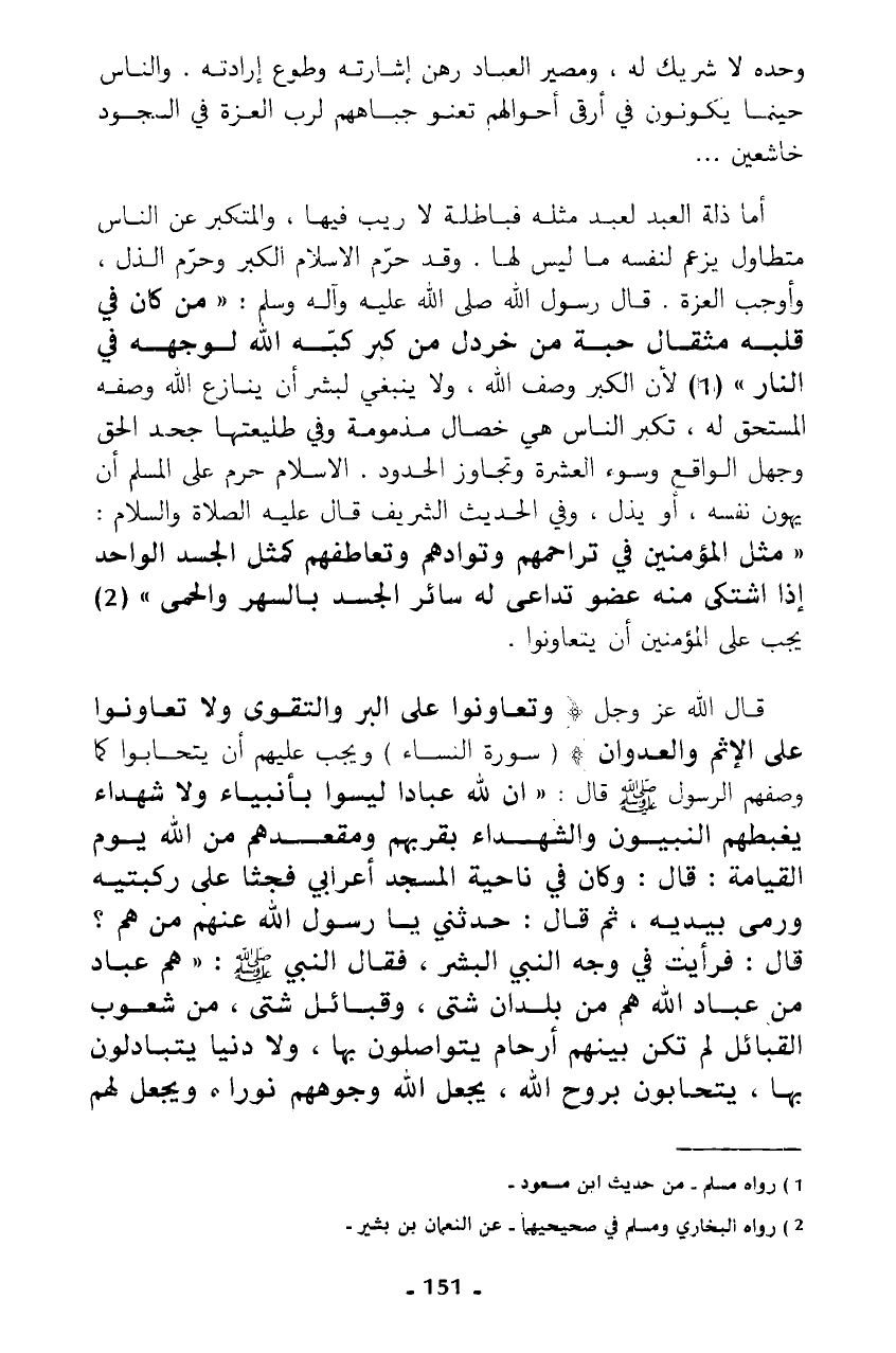 أما ذلة العبد لعبد مثله فباطلة لا ريب فيها، والمتكبر عن الناس متطاول يزعم لنفسه ما ليس لها. وقد حرم الإسلام الكبر وحرم الذل، وأوجب العزة. قال رسول الله صلى الله عليه وآله وسلم: " من كان في قلبه مثقال حبة من خردل من كبر كبه الله لوجهه في النار " (¬1) لأن الكبر وصف الله، ولا ينبغي لبشر أن ينازع الله وصفه المستحق له، تكبر الناس هي خصال مذمومة وفي طليعتها جحد الحق وجهل الواقع وسوء العشرة وتجاوز الحدود. الإسلام حرم على المسلم أن يهون نفسه، أو يذل، وفي الحديث الشريف قال عليه الصلاة والسلام: "مثل المؤمنين في تراحمهم وتوادهم وتعاطفهم كمثل الجسد الواحد إذا اشتكى منه عضو تداعى له سائر الجسد بالسهر والحمى" (¬2) يجب على المؤمنين أن يتعاونوا.