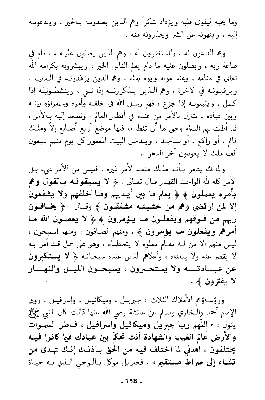 وهم الداعون له، والمستغفرون له، وهم الذين يصلون عليه ما دام في طاعة ربه، ويصلون عليه ما دام يعلم الناس الخير، ويبشرونه بكرامة الله تعالى في منامه، وعند موته ويوم بعثه، وهم الذين يزهدونه في الدنيا، ويرغبونه في الآخرة، وهم الذين يذكرونه إذا نسي، وينشطونه إذا كسل، ويثبتونه إذا جزع، فهم رسل الله في خلقه وأمره وسفراؤه بينه وبين عباده، تتنزل بالأمر من عنده في أقطار العالم، وتصعد إليه بالأمر، قد أطت بهم السماء وحق لها أن تئط ما فيها موضع أربع أصابع إلا وملك قائم، أو راكع، أو ساجد، ويدخل البيت المعمور كل يوم منهم سبعون ألف ملك لا يعودون آخر الدهر ..