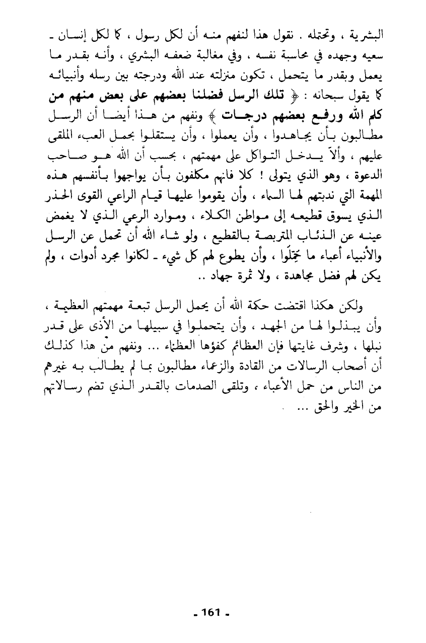 البشرية، وتحتمله. نقول هذا لنفهم منه أن لكل رسول، كما لكل إنسان- سعيه وجهده في محاسبة نفسه، وفي مغالبة ضعفه البشري، وأنه بقدر ما يعمل وبقدر ما يتحمل، تكون منزلته عند الله ودرجته بين رسله وأنبيائه كما يقول سبحاته: {تِلْكَ الرُّسُلُ فَضَّلْنَا بَعْضَهُمْ عَلَى بَعْضٍ مِنْهُمْ مَنْ كَلَّمَ اللَّهُ وَرَفَعَ بَعْضَهُمْ دَرَجَاتٍ} ونفهم من هذا أيضا أن الرسل مطالبون بأن يجاهدوا، وأن يعملوا، وأن يستقلوا بحمل العبء الملقى عليهم، وألا يدخل التواكل على مهمتهم، بحسب أن الله هو صاحب الدعوة، وهو الذي يتولى! كلا فإنهم مكلفون بأن يواجهوا بأنفسهم هذه المهمة التي ندبتهم لها السماء، وأن يقوموا عليها قيام الراعي القوي الحذر الذي يسوق قطيعه إلى مواطن الكلاء، وموارد الرعي الذي لا يغمض عينه عن الذئاب المتربصة بالقطيع، ولو شاء الله أن تحمل عن الرسل والأنبياء أعباء ما حملوا، وأن يطوع لهم كل شيء- لكانوا مجرد أدوات، ولم يكن لهم فضل مجاهدة، ولا ثمرة جهاد ..
