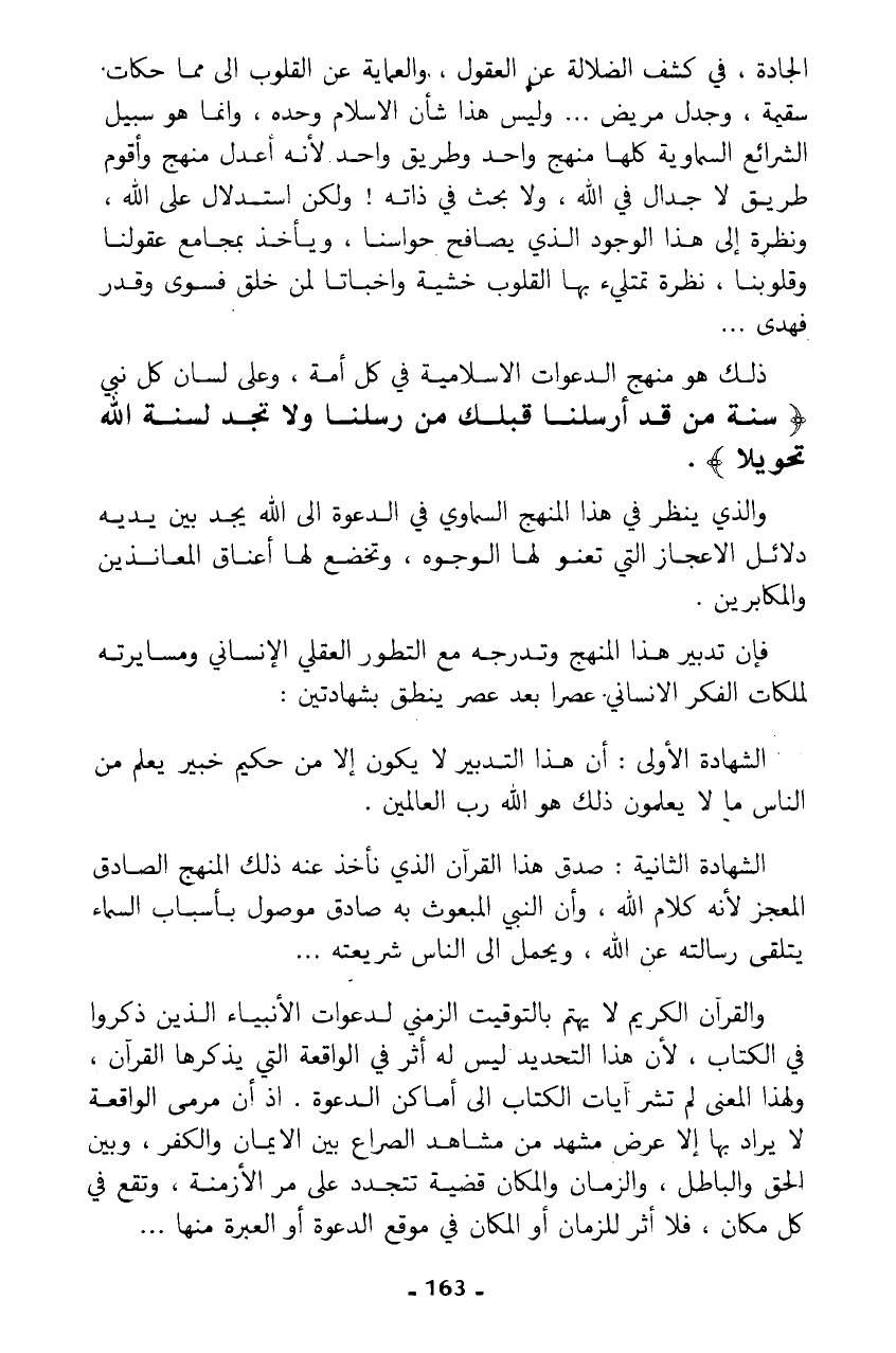 فإن تدبير هذا المنهج وتدرجه مع التطور العقلي الإنساني ومسايرته لملكات الفكر الإنساني. عصرا بعد عصر ينطق بشهادتين: