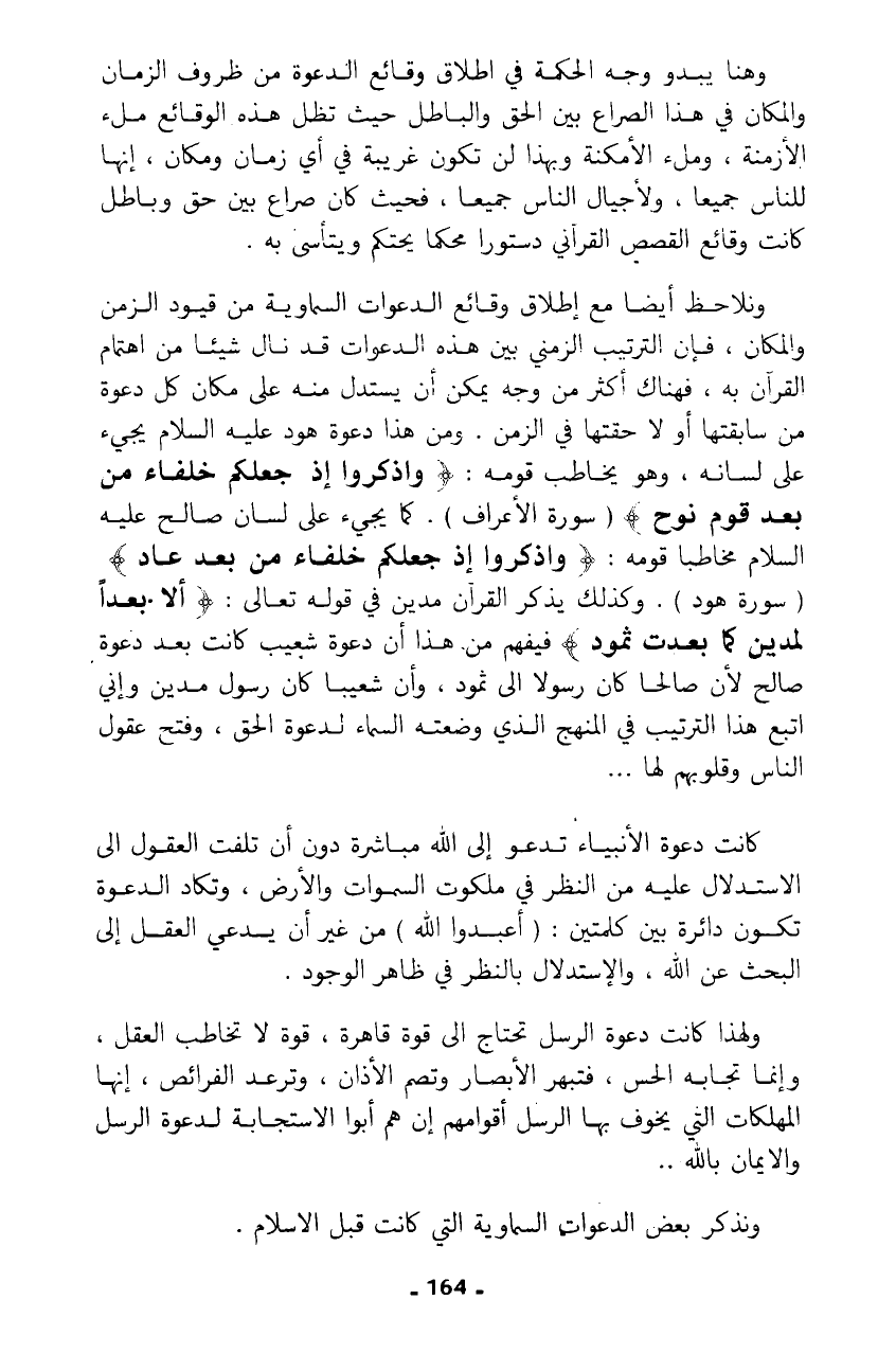 ونلاحظ أيضا مع إطلاق وقائع الدعوات السماوية من قيود الزمن والمكان، فإن الترتيب الزمني بين هذه الدعوات قد نال شيئا من اهتمام القرآن به، فهناك أكثر من وجه يمكن أن يستدل منه على مكان كل دعوة من سابقتها أو لاحقتها في الزمن. ومن هذا دعوة هود عليه السلام يجيء على لسانه، وهو يخاطب قومه: {وَاذْكُرُوا إِذْ جَعَلَكُمْ خُلَفَاءَ مِنْ بَعْدِ قَوْمِ نُوحٍ} (سورة الأعراف). كما يجيء على لسان صالح عليه السلام مخاطبا قومه: {وَاذْكُرُوا إِذْ جَعَلَكُمْ خُلَفَاءَ مِنْ بَعْدِ عَادٍ} (سورة هود). وكذلك يذكر القرآن مدين في قوله تعالى: {أَلَا بُعْدًا لِمَدْيَنَ كَمَا بَعِدَتْ ثَمُودُ} فيفهم من هذا أن دعوة شعيب كانت بعد دعوة صالح لأن صالحا كان رسولا إلى ثمود، وأن شعيبا كان رسول مدين وإني اتبع هذا الترتيب في المنهج الذي وضعته السماء لدعوة الحق، وفتح عقول الناس وقلوبهم لها ...