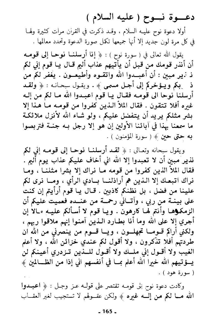 أولا دعوة نوح عليه السلام، وقد ذكرت في القرآن مرات كثيرة ولها في كل مرة لون جديد إلا أنها جميعها تكمل صورة الدعوة وتحدد معالمها.