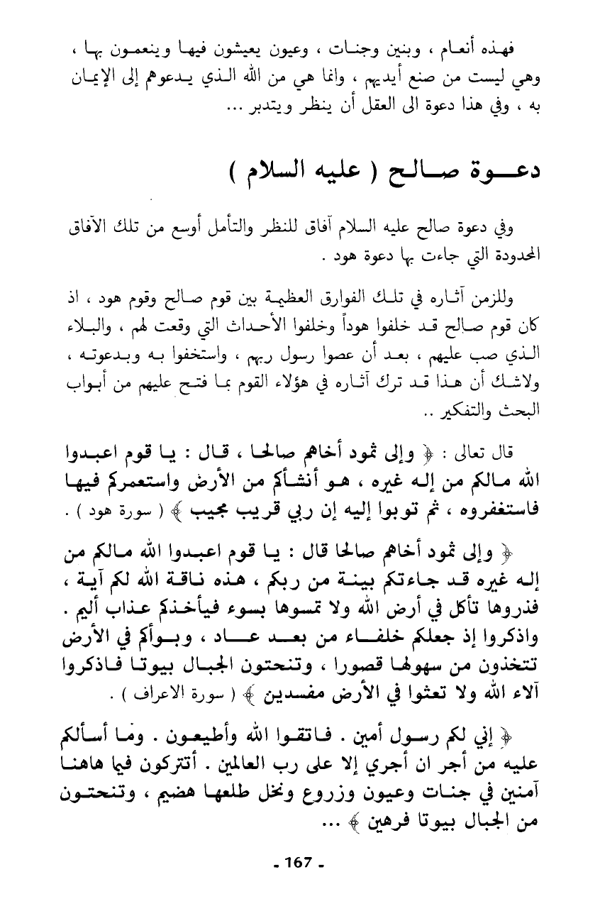 {وَإِلَى ثَمُودَ أَخَاهُمْ صَالِحًا قَالَ يَا قَوْمِ اعْبُدُوا اللَّهَ مَا لَكُمْ مِنْ إِلَهٍ غَيْرُهُ قَدْ جَاءَتْكُمْ بَيِّنَةٌ مِنْ رَبِّكُمْ هَذِهِ نَاقَةُ اللَّهِ لَكُمْ آيَةً فَذَرُوهَا تَأْكُلْ فِي أَرْضِ اللَّهِ وَلَا تَمَسُّوهَا بِسُوءٍ فَيَأْخُذَكُمْ عَذَابٌ أَلِيمٌ * وَاذْكُرُوا إِذْ جَعَلَكُمْ خُلَفَاءَ مِنْ بَعْدِ عَادٍ وَبَوَّأَكُمْ فِي الْأَرْضِ تَتَّخِذُونَ مِنْ سُهُولِهَا قُصُورًا وَتَنْحِتُونَ الْجِبَالَ بُيُوتًا فَاذْكُرُوا آلَاءَ اللَّهِ وَلَا تَعْثَوْا فِي الْأَرْضِ مُفْسِدِينَ} (سورة الاعراف).
