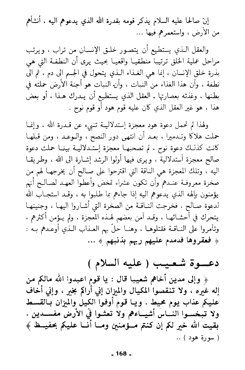 ولهذا لم تحمل دعود هود معجزة إستدلالية تنبيء عن قدرة الله، وإنما حملت هلاكا وتدميرا، بعد أن انتهى دور النصح، والوعد، ومن قبلها كانت كذلك دعوة نوح، لم تصحبها معجزة إستدلالية بينما حملت دعوة صالح معجزة استدلالية، ويرى فيها أولوا الرشد إشارة إلى الله، وطريقا إليه، وتلك المعجزة هي الناقة التي اقترحوا على صالح أن يخرجها لهم من صخرة معروفة عندهم وأن تكون عشراء تمخض وأعطوا العهد لصالح أنهم يؤمنون بإلهه الذي يدعوهم إليه إذا جاءهم بما طلبوا به، وقد استجاب الله لدعوة صالح، فخرجت الناقة من الصخرة التي أشاروا إليها، وجنينها يتحرك في أحشائها، وقد آمن بعضهم لهذه المعجزة، ولم يؤمن أكثرهم، وتآمروا على الناقة فقتلوها، وهنا حل بهم العذاب الذي أوعدهم به: {فَعَقَرُوهَا فَدَمْدَمَ عَلَيْهِمْ رَبُّهُمْ بِذَنْبِهِمْ} ...