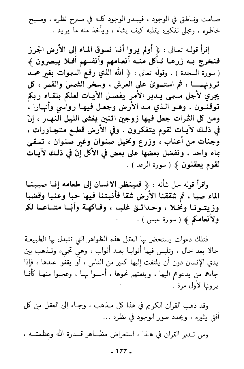 إقرأ قوله تعالى: {أَوَلَمْ يَرَوْا أَنَّا نَسُوقُ الْمَاءَ إِلَى الْأَرْضِ الْجُرُزِ فَنُخْرِجُ بِهِ زَرْعًا تَأْكُلُ مِنْهُ أَنْعَامُهُمْ وَأَنْفُسُهُمْ أَفَلَا يُبْصِرُونَ} (سورة السجدة). وقوله تعالى: {اللَّهُ الَّذِي رَفَعَ السَّمَاوَاتِ بِغَيْرِ عَمَدٍ تَرَوْنَهَا ثُمَّ اسْتَوَى عَلَى الْعَرْشِ وَسَخَّرَ الشَّمْسَ وَالْقَمَرَ كُلٌّ يَجْرِي لِأَجَلٍ مُسَمًّى يُدَبِّرُ الْأَمْرَ يُفَصِّلُ الْآيَاتِ لَعَلَّكُمْ بِلِقَاءِ رَبِّكُمْ تُوقِنُونَ * وَهُوَ الَّذِي مَدَّ الْأَرْضَ وَجَعَلَ فِيهَا رَوَاسِيَ وَأَنْهَارًا وَمِنْ كُلِّ الثَّمَرَاتِ جَعَلَ فِيهَا زَوْجَيْنِ اثْنَيْنِ يُغْشِي اللَّيْلَ النَّهَارَ إِنَّ فِي ذَلِكَ لَآيَاتٍ لِقَوْمٍ يَتَفَكَّرُونَ * وَفِي الْأَرْضِ قِطَعٌ مُتَجَاوِرَاتٌ وَجَنَّاتٌ مِنْ أَعْنَابٍ وَزَرْعٌ وَنَخِيلٌ صِنْوَانٌ وَغَيْرُ صِنْوَانٍ يُسْقَى بِمَاءٍ وَاحِدٍ وَنُفَضِّلُ بَعْضَهَا عَلَى بَعْضٍ فِي الْأُكُلِ إِنَّ فِي ذَلِكَ لَآيَاتٍ لِقَوْمٍ يَعْقِلُونَ} (سورة الرعد).