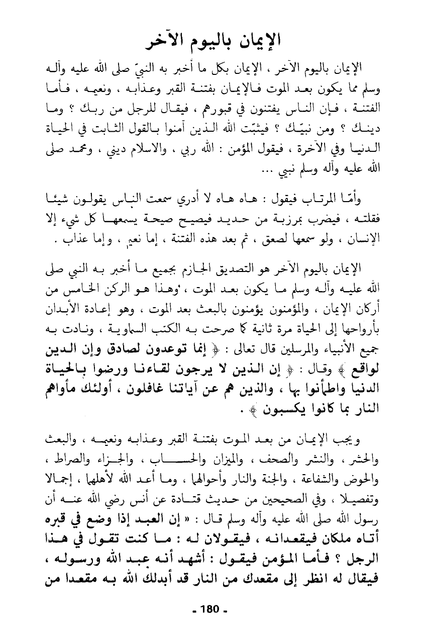 ويجب الإيمان من بعد الموت بفتنة القبر وعذابه ونعيمه، والبعث والحشر، والنشر والصحف، والميزان والحساب، والجزاء والصراط، والحوض والشفاعة، والجنة والنار وأحوالهما، وما أعد الله لأهلهما، إجمالا وتفصيلا، وفي الصحيحين من حديث قتادة عن أنس رضي الله عنه أن رسول الله صلى الله عليه وآله وسلم قال: "إن العبد إذا وضع في قبره أتاه ملكان فيقعدانه، فيقولان له: ما كنت تقول في هذا الرجل؟ فأما المؤمن فيقول: أشهد أنه عبد الله ورسوله، فيقال له انظر إلى مقعدك من النار قد أبدلك الله به مقعدا من