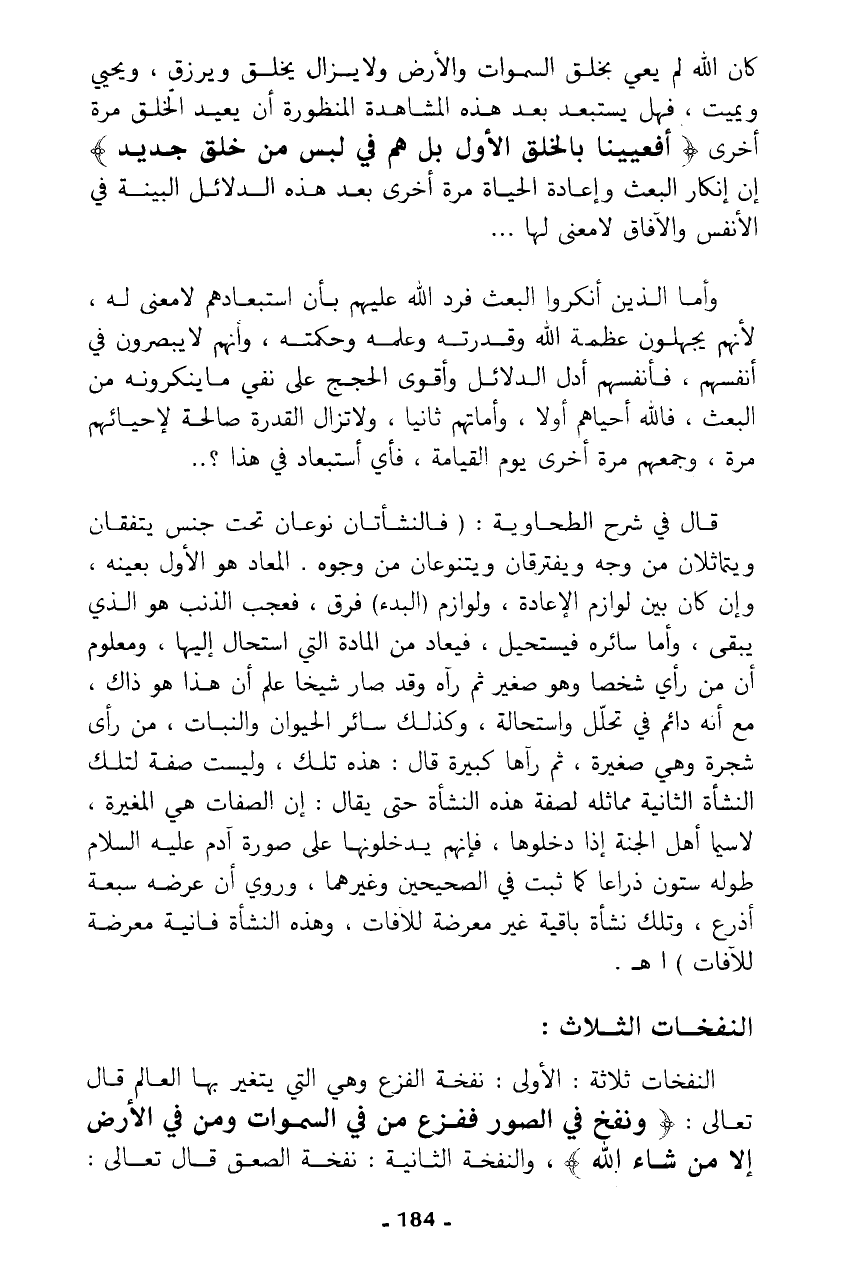 قال في شرح الطحاوية: (فالنشأتان نوعان تحت جنس يتفقان ويتماثلان من وجه ويفترقان ويتنوعان من وجوه. المعاد هو الأول بعينه، وإن كان بين لوازم الإعادة، ولوازم (البدء) فرق، فعجب الذنب هو الذي يبقى، وأما سائره فيستحيل، فيعاد من المادة التي استحال إليها، ومعلوم أن من رأى شخصا وهو صغير ثم رآه وقد صار شيخا علم أن هذا هو ذاك، مع أنه دائم في تحلل واستحالة، وكذلك سائر الحيوان والنبات، من رأى شجرة وهي صغيرة، ثم رآها كبيرة قال: هذه تلك، وليست صفة لتلك النشأة الثانية مماثله لصفة هذه النشأة حتى يقال: إن الصفات هي المغيرة، لاسيما أهل الجنة إذا دخلوها، فإنهم يدخلونها على صورة آدم عليه السلام طوله ستون ذراعا كما ثبت في الصحيحين وغيرهما، وروي أن عرضه سبعة أذرع، وتلك نشأة باقية غير معرضة للآفات، وهذه النشأة فانية معرضة للآفات) اهـ.