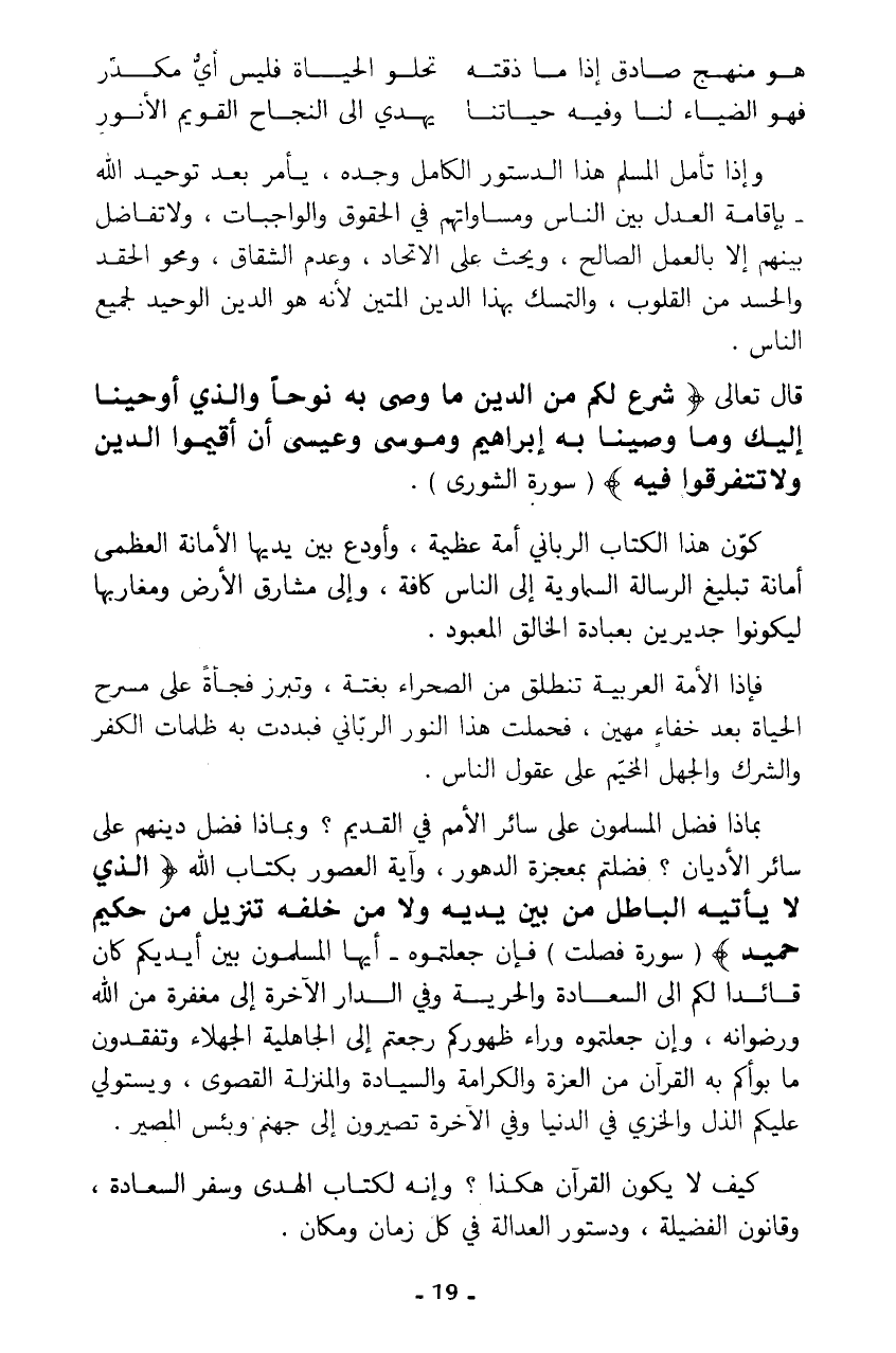 بماذا فضل المسلمون على سائر الأمم في القديم؟ وبماذا فضل دينهم على سائر الأديان؟ فضلتم بمعجزة الدهور، وآية العصور بكتاب الله الذي {لَا يَأْتِيهِ الْبَاطِلُ مِنْ بَيْنِ يَدَيْهِ وَلَا مِنْ خَلْفِهِ تَنْزِيلٌ مِنْ حَكِيمٍ حَمِيدٍ} (سورة فصلت) فإن جعلتموه - أيها المسلمون بين أيديكم كان قائدا لكم إلى السعادة والحرية وفي الدار الآخرة إلى مغفرة من الله ورضوانه، وإن جعلتموه وراء ظهوركم رجعتم إلى الجاهلية الجهلاء وتفقدون ما بوأكم به القرآن من العزة والكرامة والسيادة والمنزلة القصوى، ويستولي عليكم الذل والخزي في الدنيا وفي الآخرة تصيرون إلى جهنم وبئس المصير.