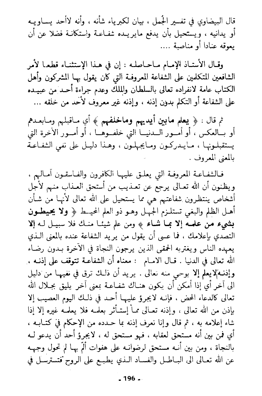 فالشفاعة المعروفة التي يعلق عليها الكافرون والفاسقون آمالهم، ويظنون أن الله تعالى يرجع عن تعذيب من استحق العذاب منهم لأجل أشخاص ينتظرون شفاعتهم هي مما يستحيل على الله تعالى لأنها من شأن أهل الظلم والبغي تستلزم الجهل وهو ذو العلم المحيط {وَلَا يُحِيطُونَ بِشَيْءٍ مِنْ عِلْمِهِ إِلَّا بِمَا شَاءَ} ومن علم شيئا منك فلا سبيل له إلا التصدي بإعلامك، فما عسى أن يقول من يريد الشفاعة عنده بالمعنى الذي يعهده الناس ويغتر به الحمقى الذين يرجون النجاة في الآخرة بدون رضاء الله تعالى في الدنيا. قال الإمام: معناه أن الشفاعة تتوقف على إذنه، وإذنه لا يعلم إلا بوحي منه تعالى. يريد أن ذلك ترق في نفيها من دليل إلى آخر أي إذا أمكن أن يكون هناك شفاعة بمعنى آخر يليق بجلال الله تعالى كالدعاء المحض، فإنه لا يجرؤ عليها أحد في ذلك اليوم العصيب إلا بإذن من الله تعالى، وإذنه تعالى مما إستأثر بعلمه فلا يعلمه غيره إلا إذا شاء إعلامه به، ثم قال وإنا نعرف إذنه بما حدده من الإحكام في كتابه، أي فمن بين أنه مستحق لعقابه، فهو مستحق له، لا يجرؤ أحد أن يدعو له بالنجاة، ومن بين أنه مستحق لرضوانه على هفوات ألم بها لم تحول وجهه عن الله تعالى إلى الباطل والفساد الذي يطبع على الروح فتسترسل في