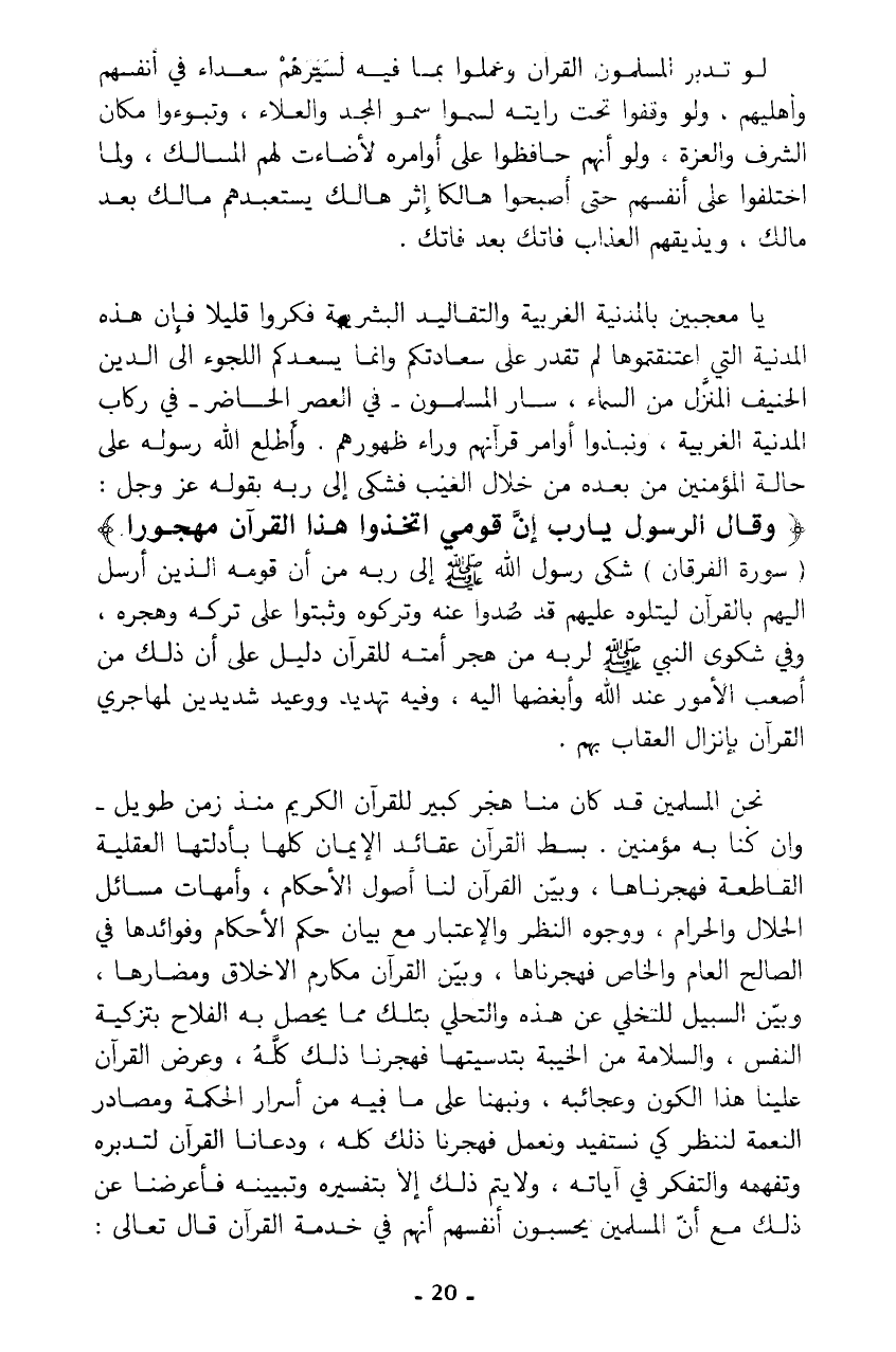 يا معجبين بالمدنية الغربية والتقاليد البشرية فكروا قليلا فإن هذه المدنية التي اعتنقتموها لم تقدر على سعادتكم وإنما يسعدكم اللجوء إلى الدين الحنيف المنزل من السماء، سار المسلمون - في العصر الحاضر- في ركاب المدنية الغربية، ونبذوا أوامر قرآنهم وراء ظهورهم. وأطلع الله رسوله على حالة المؤمنين من بعده من خلال الغيب فشكى إلى ربه بقوله عز وجل: {وَقَالَ الرَّسُولُ يَا رَبِّ إِنَّ قَوْمِي اتَّخَذُوا هَذَا الْقُرْآنَ مَهْجُورًا} (سورة الفرقان) شكى رسول الله - صلى الله عليه وسلم - إلى ربه من أن قومه الذين أرسل إليهم بالقرآن ليتلوه عليهم قد صدوا عنه وتركوه وثبتوا على تركه وهجره، وفي شكوى النبي - صلى الله عليه وسلم - لربه من هجر أمته للقرآن دليل على أن ذلك من أصعب الأمور عند الله وأبغضها إليه، وفيه تهديد ووعيد شديدين لمهاجري القرآن بإنزال العقاب بهم.