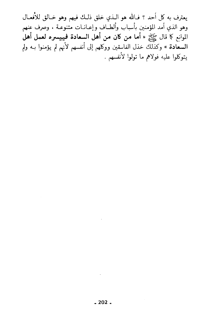 يعترف به كل أحد؟ فالله هو الذي خلق ذلك فيهم وهو خالق للأفعال وهو الذي أمد المؤمنين بأسباب وألطاف وإعانات متنوعة، وصرف عنهم الموانع كما قال - صلى الله عليه وسلم - "أما من كان من أهل السعادة فييسره لعمل أهل السعادة" وكذلك خذل الفاسقين ووكلهم إلى أنفسهم لأنهم لم يؤمنوا به ولم يتوكلوا عليه فولاهم ما تولوا لأنفسهم.