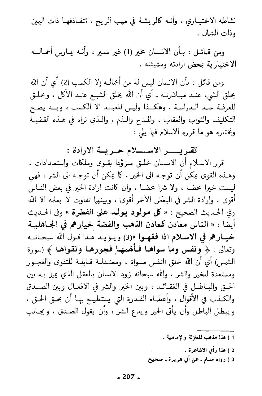 ومن قائل: بأن الإنسان مخير (¬1) غير مسير، وأنه يمارس أعماله الاختيارية بمحض إرادته ومشيئته.