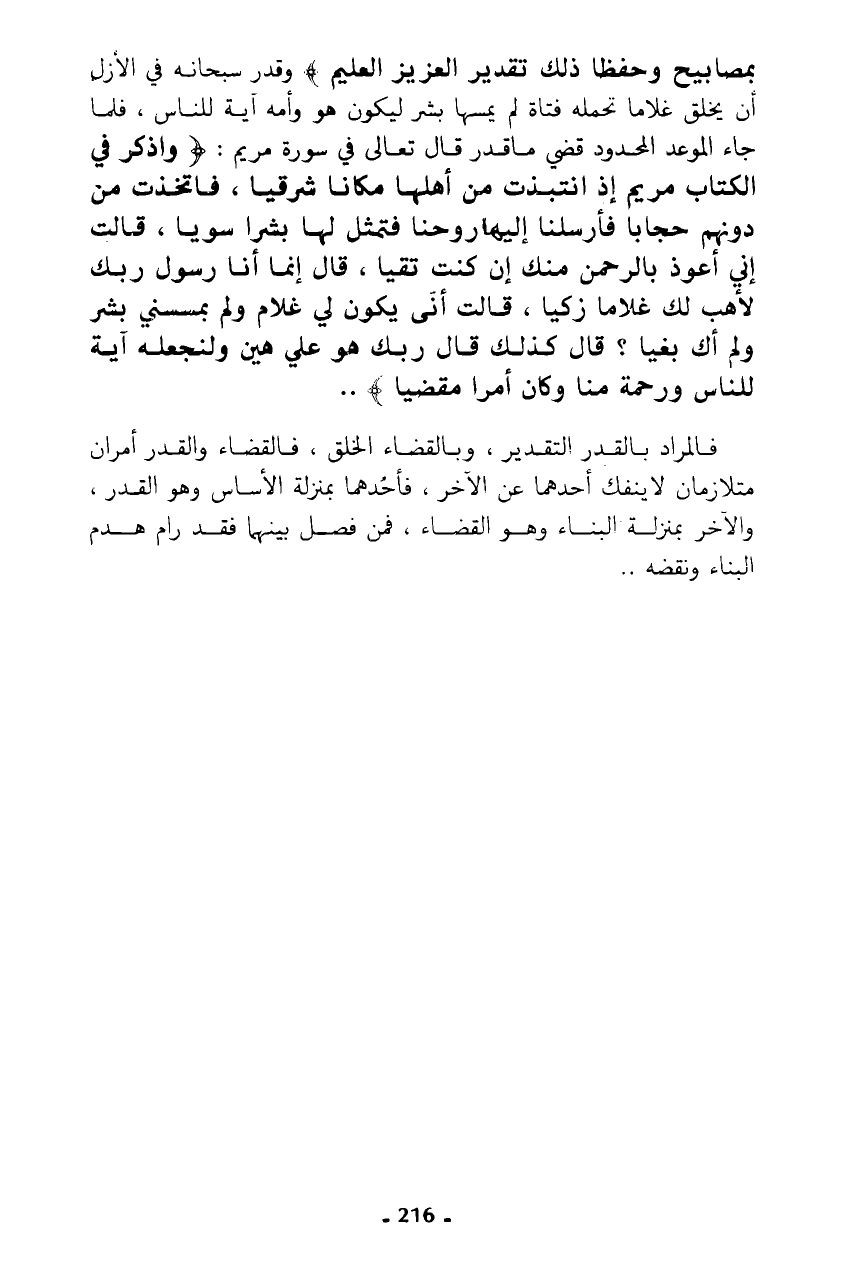 بِمَصَابِيحَ وَحِفْظًا ذَلِكَ تَقْدِيرُ الْعَزِيزِ الْعَلِيمِ}، وقدر سبحانه في الأزل أن يخلق غلاما تحمله فتاة لم يمسها بشر ليكون هو وأمه آية للناس، فلما جاء الوعد المحدود قضي ما قدر قال تعالى في سورة مريم: {وَاذْكُرْ فِي الْكِتَابِ مَرْيَمَ إِذِ انْتَبَذَتْ مِنْ أَهْلِهَا مَكَانًا شَرْقِيًّا * فَاتَّخَذَتْ مِنْ دُونِهِمْ حِجَابًا فَأَرْسَلْنَا إِلَيْهَا رُوحَنَا فَتَمَثَّلَ لَهَا بَشَرًا سَوِيًّا * قَالَتْ إِنِّي أَعُوذُ بِالرَّحْمَنِ مِنْكَ إِنْ كُنْتَ تَقِيًّا * قَالَ إِنَّمَا أَنَا رَسُولُ رَبِّكِ لِأَهَبَ لَكِ غُلَامًا زَكِيًّا * قَالَتْ أَنَّى يَكُونُ لِي غُلَامٌ وَلَمْ يَمْسَسْنِي بَشَرٌ وَلَمْ أَكُ بَغِيًّا * قَالَ كَذَلِكِ قَالَ رَبُّكِ هُوَ عَلَيَّ هَيِّنٌ وَلِنَجْعَلَهُ آيَةً لِلنَّاسِ وَرَحْمَةً مِنَّا وَكَانَ أَمْرًا مَقْضِيًّا} ..
