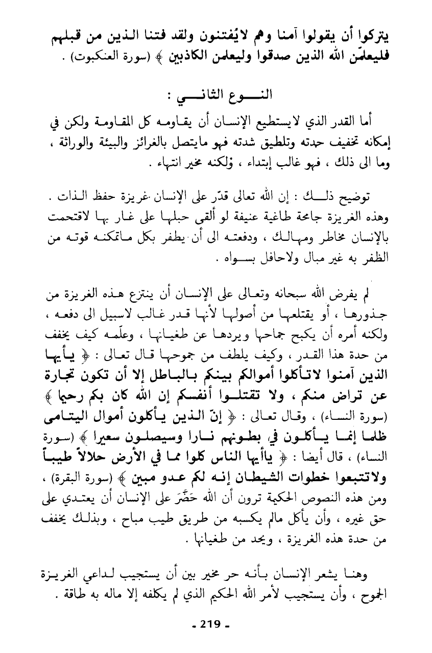 وهنا يشعر الإنسان بأنه حر مخير بين أن يستجيب لداعي الغريزة الجموح، وأن يستجيب لأمر الله الحكيم الذي لم يكلفه إلا ما له به طاقة.