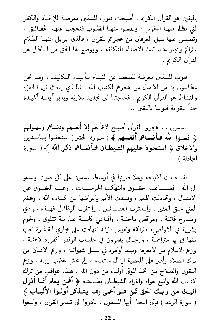 لقد طغت الإباحة وعلا صوتها في أوساط المسلمين على كل صوت يدعو إلى الله، فضاعت الحقوق وانتهكت الحرمات، وغلب العقوق على الامتثال، وتخاذلت الهمم، وفسدت الأمم بإعراضها عن كتاب الله، وهضم الغني حق الفقير، واندثرت الفضائل، وانتثرت الرذائل فهذه نوادي ومسارح فاتنة، ومراقص ماجنة، وأفاعي كاسية عارية تتلوى، ولحوم بشرية في الشواطيء متراكة ونفوس دنيئة تتهافت على مجاري القذارة تعب منها في نهم متزاحمة، ورجال يقفزون في حلبات الرقص كقرود لاهثة، وزعم الإسلام من لا يعرفه ونبذ أوامره في سبيل شهواته، وزم الإيمان من ترك الصلاة وأصر على العصية لينال مبتغاه، ولم يخش غضب ربه، وزم التقوى والصلاح من اتخذ الموتى أولياء من دون الله. هذه عواقب من ترك كتاب الله واتبع هواه وأغراه الشيطان بطاعته {أَفَمَنْ يَعْلَمُ أَنَّمَا أُنْزِلَ إِلَيْكَ مِنْ رَبِّكَ الْحَقُّ كَمَنْ هُوَ أَعْمَى إِنَّمَا يَتَذَكَّرُ أُولُو الْأَلْبَابِ} (سورة الرعد) فإلى النجا أيها المسلمون، بادروا إلى تدبر القرآن، واسعوا