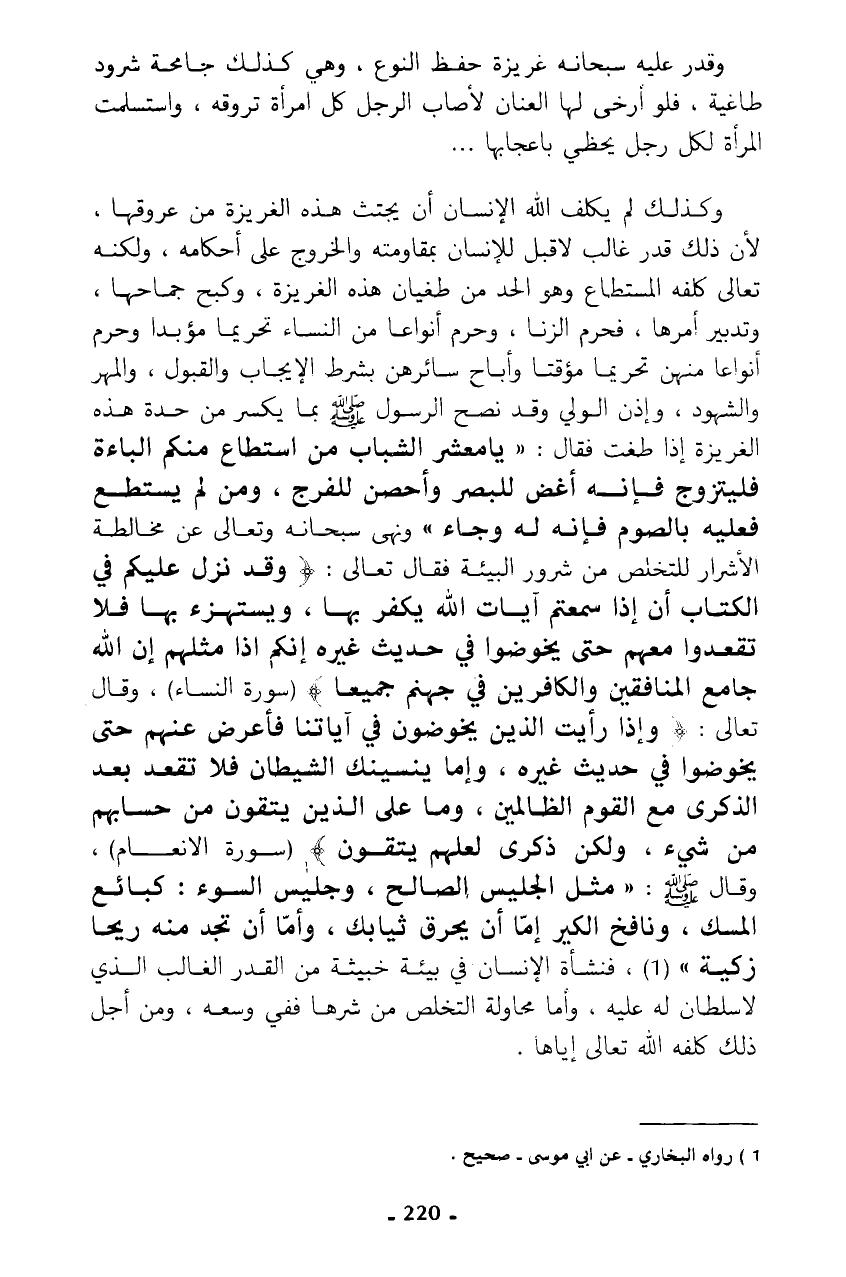 وكذلك لم يكلف الله الإنسان أن يجتث هذه الغريزة من عروقها، لأن ذلك قدر غالب لا قبل للإنسان بمقاومته والخروج على أحكامه، ولكنه تعالى كلفه المستطاع وهو الحد من طغيان هذه الغريزة، وكبح جماحها، وتدبير أمرها، فحرم الزنا، وحرم أنواعا من النساء تحريما مؤبدا وحرم أنواعا منهن تحريما مؤقتا وأباح سائرهن بشرط الإيجاب والقبول، والمهر والشهود، وإذن الولي وقد نصح الرسول - صلى الله عليه وسلم -، بما يكسر من حدة هذه الغريزة إذا طغت فقال: "يا معشر الشباب من استطاع منكم الباءة فليتزوج فإنه أغض للبصر وأحصن للفرج، ومن لم يستطع فعليه بالصوم فإنه له وجاء" ونهى سبحانه وتعالى عن مخالطة الأشرار للتخلص من شرور البيئة فقال تعالى: {وَقَدْ نَزَّلَ عَلَيْكُمْ فِي الْكِتَابِ أَنْ إِذَا سَمِعْتُمْ آيَاتِ اللَّهِ يُكْفَرُ بِهَا وَيُسْتَهْزَأُ بِهَا فَلَا تَقْعُدُوا مَعَهُمْ حَتَّى يَخُوضُوا فِي حَدِيثٍ غَيْرِهِ إِنَّكُمْ إِذًا مِثْلُهُمْ إِنَّ اللَّهَ جَامِعُ الْمُنَافِقِينَ وَالْكَافِرِينَ فِي جَهَنَّمَ جَمِيعًا} (سورة النساء)، وقال تعالى: {وَإِذَا رَأَيْتَ الَّذِينَ يَخُوضُونَ فِي آيَاتِنَا فَأَعْرِضْ عَنْهُمْ حَتَّى يَخُوضُوا فِي حَدِيثٍ غَيْرِهِ وَإِمَّا يُنْسِيَنَّكَ الشَّيْطَانُ فَلَا تَقْعُدْ بَعْدَ الذِّكْرَى مَعَ الْقَوْمِ الظَّالِمِينَ * وَمَا عَلَى الَّذِينَ يَتَّقُونَ مِنْ حِسَابِهِمْ مِنْ شَيْءٍ وَلَكِنْ ذِكْرَى لَعَلَّهُمْ يَتَّقُونَ} (سورة الانعام)، وقال - صلى الله عليه وسلم -: "مثل الجليس الصالح، وجليس السوء: كبائع المسك، ونافخ الكير إما أن يحرق ثيابك، وإما أن تجد منه ريحا زكية" (¬1)، فنشأة الإنسان في بيئة خبيثة من القدر الغالب الذي لا سلطان له عليه، وأما محاولة التخلص من شرها ففي وسعه، ومن أجل ذلك كلفه الله تعالى إياها.
