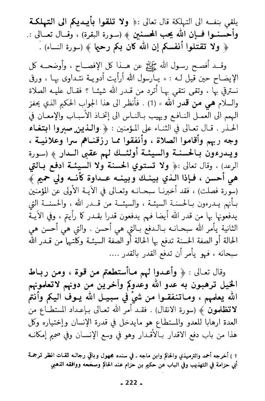 وقد أفصح رسول الله - صلى الله عليه وسلم - عن هذا كل الإفصاح، وأوضحه كل الإيضاح حين قيل له: "يا رسول الله أرأيت أدوية نتداوى بها، ورقى نستقي بها، وتقى نتقي بها أترد من قدر الله شيئا؟ فقال عليه الصلاة والسلام هي من قدر الله" (¬1). فانظر الى هذا الجواب الحكيم الذي يحفز الهمم الى العمل النافع ويهيب بالناس الى إتخاذ الأسباب والإمعان في الحذر. قال تعالى في الثناء على المؤمنين: {وَالَّذِينَ صَبَرُوا ابْتِغَاءَ وَجْهِ رَبِّهِمْ وَأَقَامُوا الصَّلَاةَ وَأَنْفَقُوا مِمَّا رَزَقْنَاهُمْ سِرًّا وَعَلَانِيَةً وَيَدْرَءُونَ بِالْحَسَنَةِ السَّيِّئَةَ أُولَئِكَ لَهُمْ عُقْبَى الدَّارِ} (سورة الرعد)، وقال تعالى: {وَلَا تَسْتَوِي الْحَسَنَةُ وَلَا السَّيِّئَةُ ادْفَعْ بِالَّتِي هِيَ أَحْسَنُ فَإِذَا الَّذِي بَيْنَكَ وَبَيْنَهُ عَدَاوَةٌ كَأَنَّهُ وَلِيٌّ حَمِيمٌ} (سورة فصلت)، فقد أخبرنا سبحانه وتعالى في الآية الأولى عن المؤمنين بأنهم يدرءون بالحسنة السيئة، والسيئة من قدر الله، والحسنة التي يدفعونها بها من قدر الله أيضا فهم يدفعون قدرا بقدر كما رأيتم، وفي الآية الثانية يأمر الله سبحانه بالدفع بالتي هي أحسن. والتي هي أحسن هي الحالة أو الصفة الحسنة تدفع بها الحالة أو الصفة السيئة وكلتاهما من قدر الله سبحانه، فهو يأمر أن تدفع القدر بالقدر ....