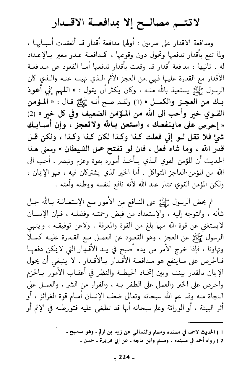 ومدافعة الاقدار على ضربين: أولهما مدافعة أقدار قد أنعقدت أسبابها، ولا تقع بأقدار تدفعها وتحول دون وقوعها، كمدافعة عدو مغير بالإعداد له. ثانيها: مدافعة أقدار قد وقعت بأقدار تدفعها أما القعود عن مدافعة الأقدار مع القدرة عليها فهي من العجز الآثم الذي نهينا عنه والذي كان الرسول - صلى الله عليه وسلم - يستعيذ بالله منه، وكان يكثر أن يقول: "اللهم إني أعوذ بك من العجز والكسل" (¬1) ولقد صح أنه - صلى الله عليه وسلم - قال: "المؤمن القوي خير وأحب الى الله من المؤمن الضعيف وفي كل خير" (¬2) "إحرص على ما ينفعك، واستعن بالله ولا تعجز، وإن أصابك شيء فلا تقل لو إني فعلت كذا وكذا لكان كذا وكذا، ولكن قل قدر الله، وما شاء فعل، فإن لو تفتح عمل الشيطان" ومعنى هذا الحديث أن المؤمن القوي الذي يأخذ أموره بقوة وعزم وتبصر، أحب الى الله من المؤمن العاجز المتواكل. أما الخير الذي يشتركان فيه، فهو الإيمان، ولكن المؤمن القوي ممتاز عند الله لأنه نافع لنفسه ووطنه وأمته.